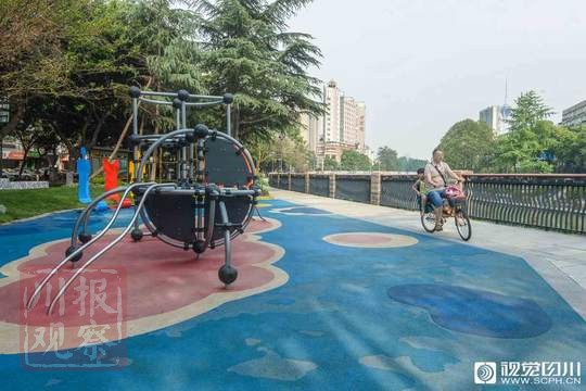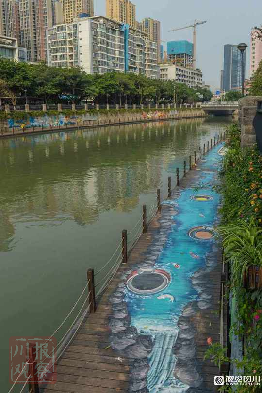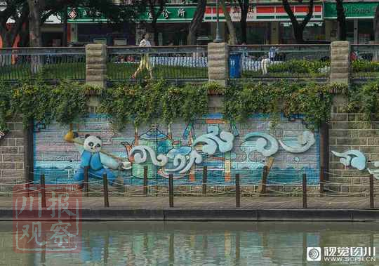 河道两岸虽然只有短短的几百米,但这里正发生着很大的变化。这里的景观、人行步道、护栏等等都是新的,并且还增加了健身步道以及健身器械。河边的墙壁上形象各异川剧脸谱 、火锅等四川特色的美术作品把这里装饰一新。路过这里散步健身看风景让人无比的惬意。