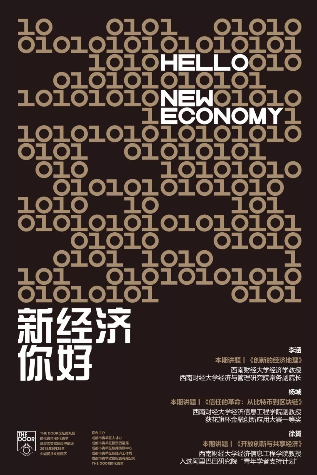 本期THE DOOR携手“西南财经黄埔军校天团”,邀请西南财经大学教授、中组部国家“千人计划专家”段江,西南财经大学经济学教授李涵,西南财经大学信息管理与信息系统主任杨城,西南财经大学经济信息工程学院教授徐贇,和你聊聊区块链、比特币、创新经济地理和共享经济等话题。
