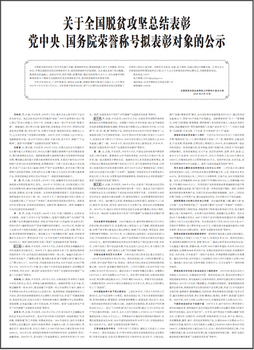 为充分发扬民主、广泛听取意见、接受社会监督,现就拟表彰对象进行全国公示,公示期为2021年2月12日至2月16日。对拟表彰对象有异议的,请于公示期内向全国脱贫攻坚总结表彰工作领导小组办公室反映。反映形式为电话、信函、电子邮件,信函以到达日邮戳为准。以单位名义反映情况的材料需加盖单位公章,以个人名义反映情况的材料应署实名,并提供联系电话。