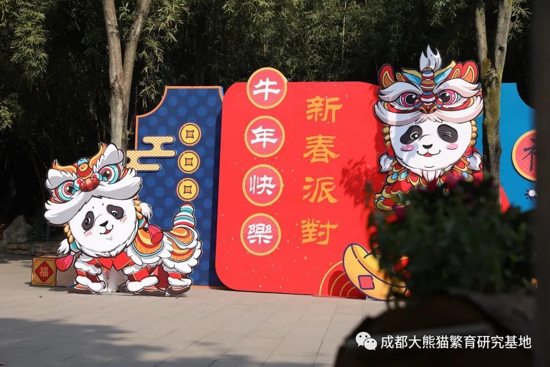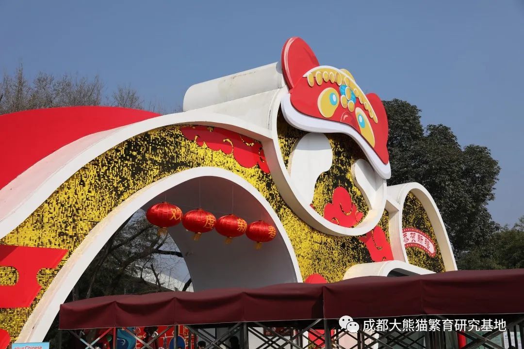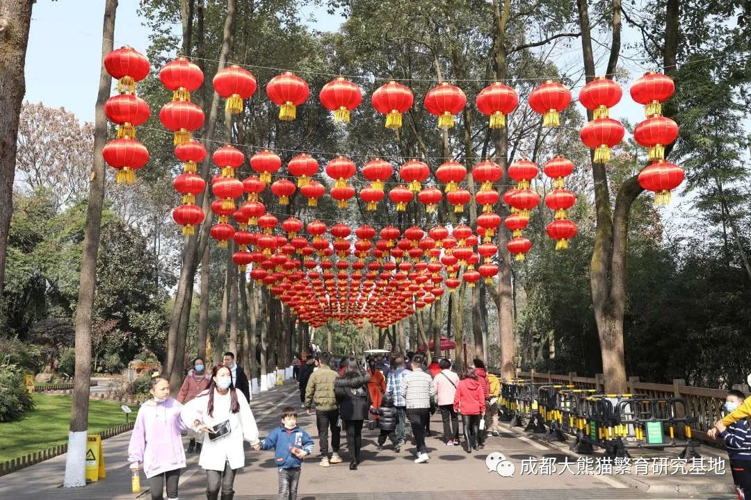春节期间,成都大熊猫繁育研究基地依然采取限制单日游客量和园区内实时最大游客量以及网络提前购票的限流措施,为吸引广大游客的到来,成都大熊猫繁育研究基地也是早早地就换上了节日的盛装,闪亮的大门,大红的灯笼,以及遍布基地各个角落的大熊猫卡通形象打卡地,到处都是一派喜气洋洋的景象。