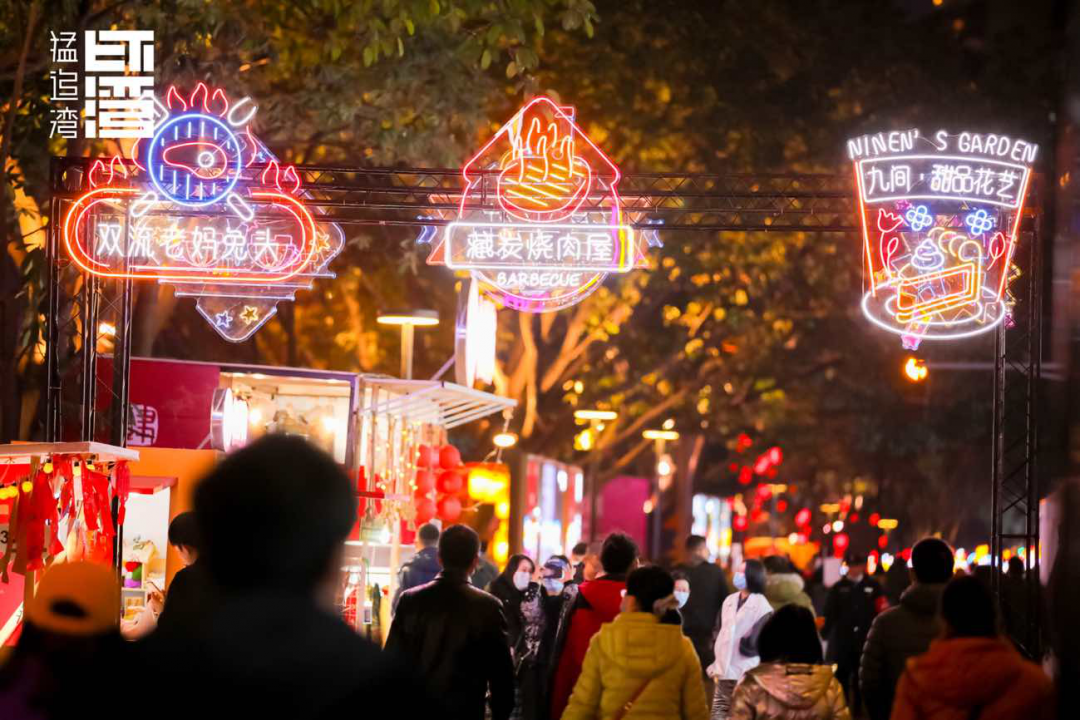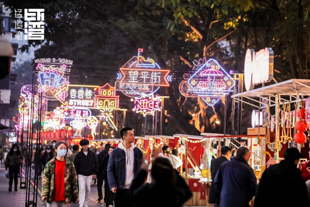 特别是追光集市,市民在这里不仅可以感受霓虹灯的色彩,而且还能携手同伴穿梭在市场中体会年味,与独属于成都的市井烟火气合影。