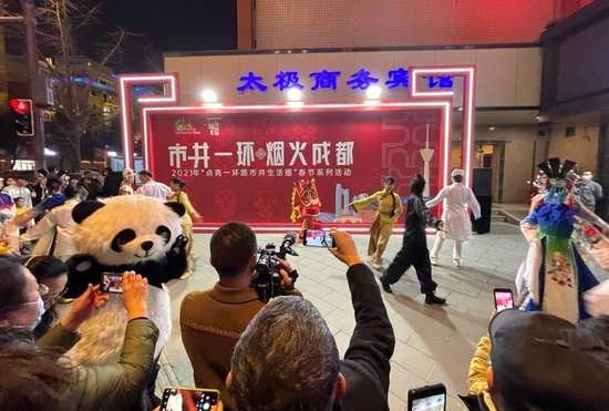 不仅如此,形式多样的灯光秀活动也在春节期间精彩上演。其中,“点亮一环路市井生活圈”春节系列活动在建设路、339天府熊猫塔、猛追湾望平坊特色街区等地标建筑区域举行亮灯活动,吸引了大批市民前往。“东郊有戏”系列活动之“中国功夫春节联欢晚会”录制线上播出及2021亮灯系列活动、猛追新潮光影艺术节、侏罗纪光影艺术节以及近20场我们的节日·春节—“欢度新春”成华街头音乐秀等活动,也为辖区群众的节日生活提供了时尚潮流的好去处。
