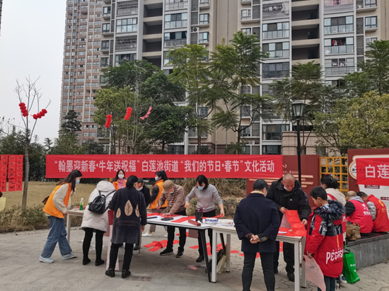 从1月底开始,成华区组织各街道社区开展了“我们的节日·春节”系列喜迎新春的文化活动,在辖区内营造了喜庆的过节氛围。截至目前,全区已开展写春联送福字文化惠民活动、新春绿道活动、文艺演出、群众春晚、主题宣讲、少儿阅读、春节庙会以及新春游园会等各类群众联欢活动。