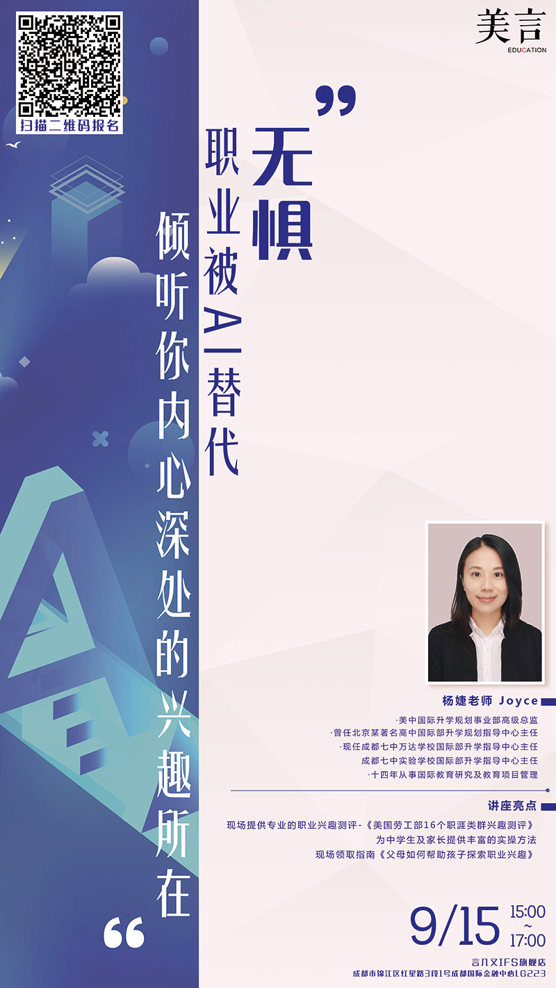 主讲:杨婕(美中国际升学规划事业部高级总监、现任成都七中万达学校国际部主任,十四年从事国际教育研究和教育管理)