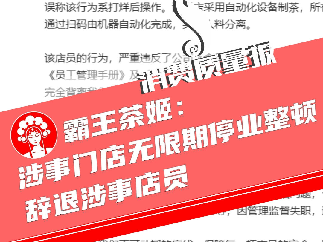 霸王茶姬:涉事门店无限期停业整顿,辞退涉事店员