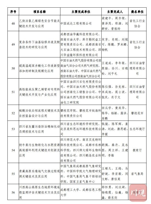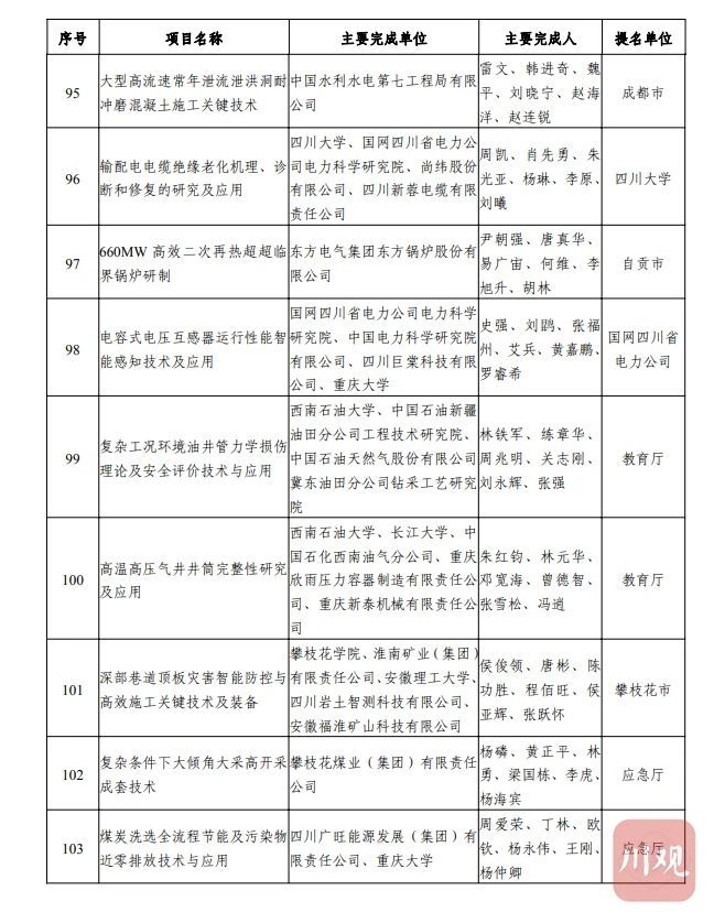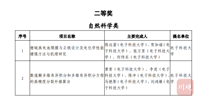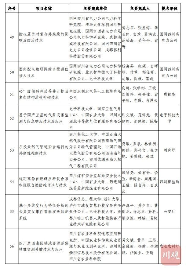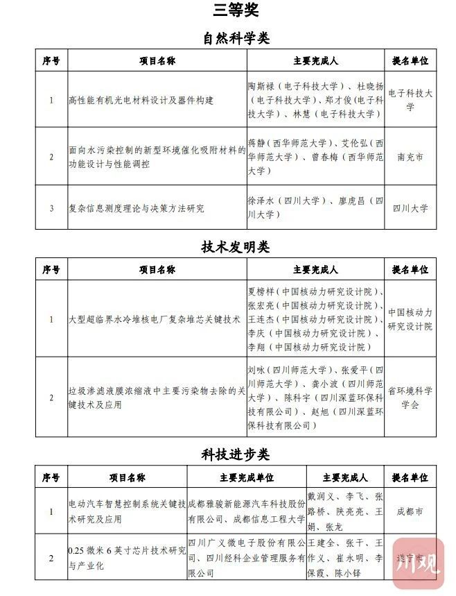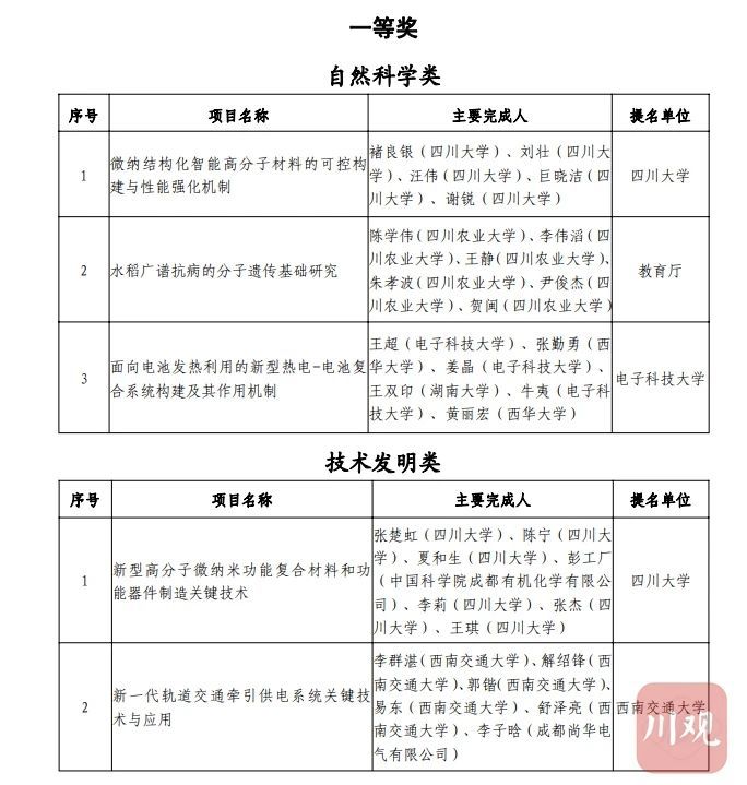 四川省科学技术进步奖项目共计265项。“微纳结构化智能高分子材料的可控构建与性能强化机制”等 36 项成果获四川省科学技术进步奖一等奖,“锂硫族电池隔膜与正极设计及电化学性能增强方法与机理研究” 等 80 项成果获四川省科学技术进步奖二等奖,“高性能有机光电材料设计及器件构建” 等 147 项成果获四川省科学技术进步奖三等奖。