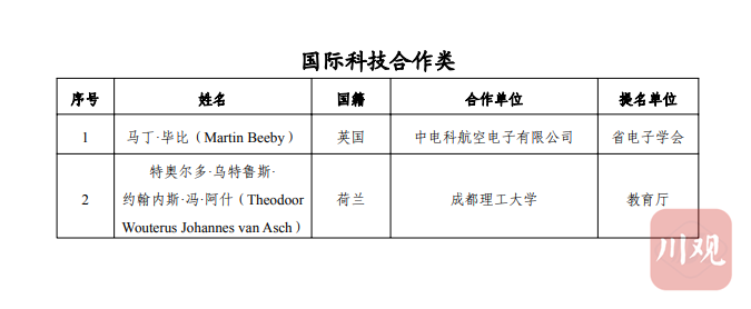 马丁·毕比( Martin Beeby) 、特奥尔 多 · 乌 特 鲁 斯 · 约 翰 内 斯 · 冯 · 阿 什 ( Theodoor Wouterus Johannes van Asch)被授予国际科技合作类奖。