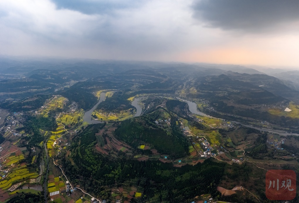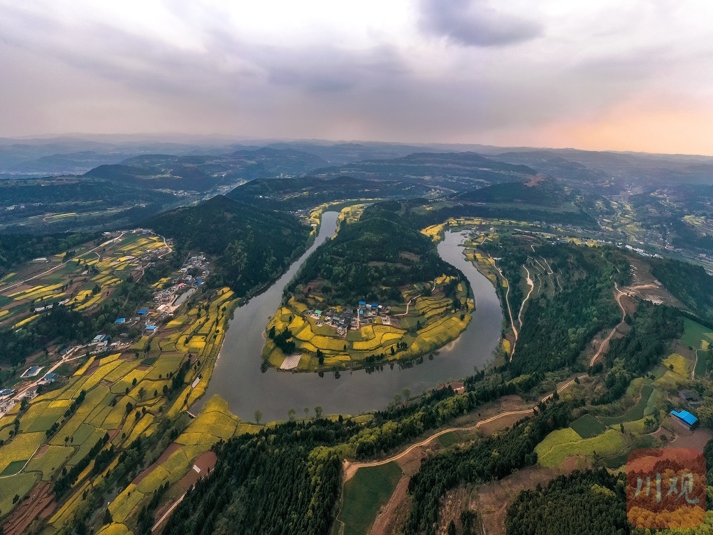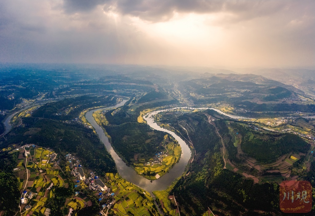 天台山大回湾位于中江县瓦店乡,凯江河流绕天台山而过,呈半圆弧,形成大回湾,如玉带环腰。每年春天,绿树、菜花与碧水相依,河流、青山与蓝天相映,形成一幅美丽画卷。