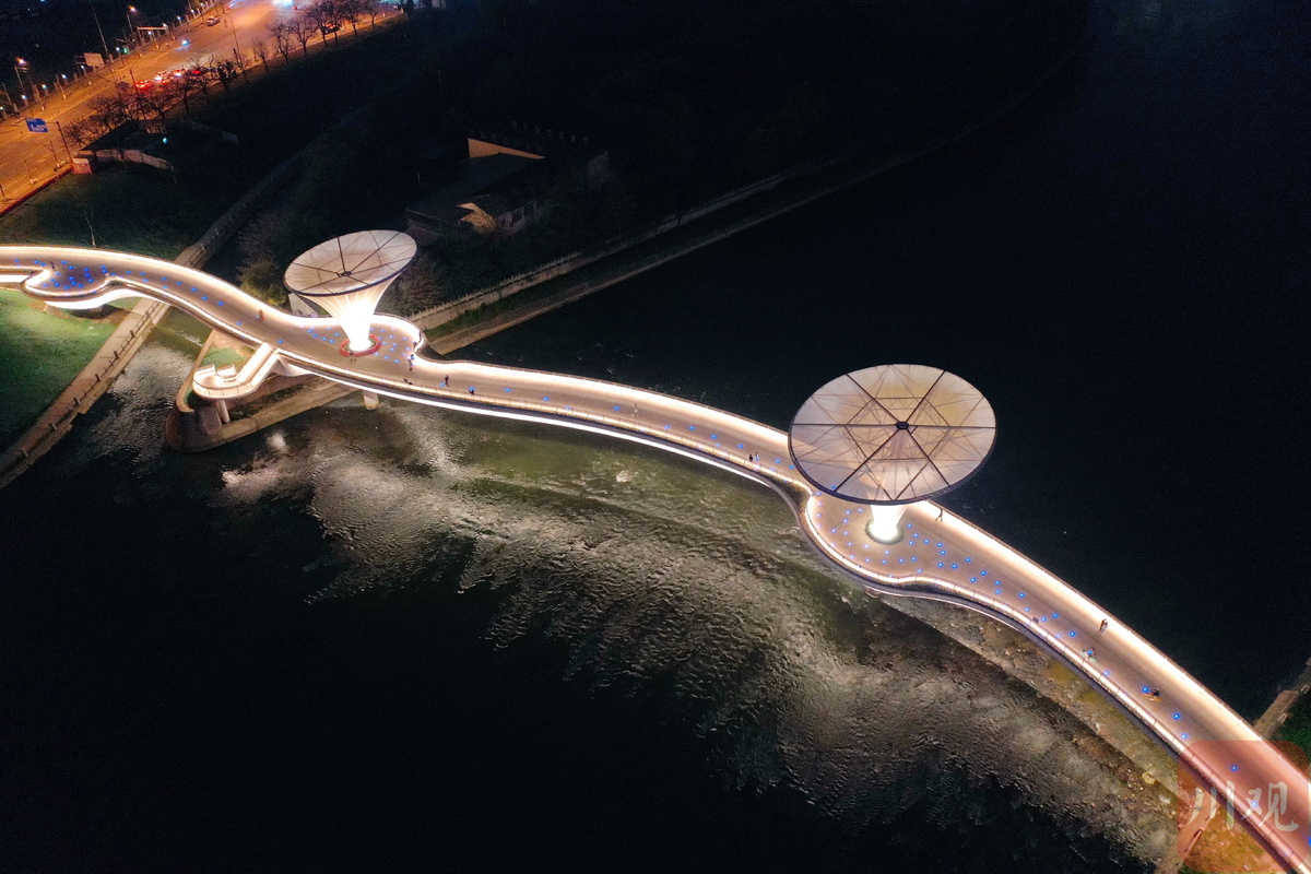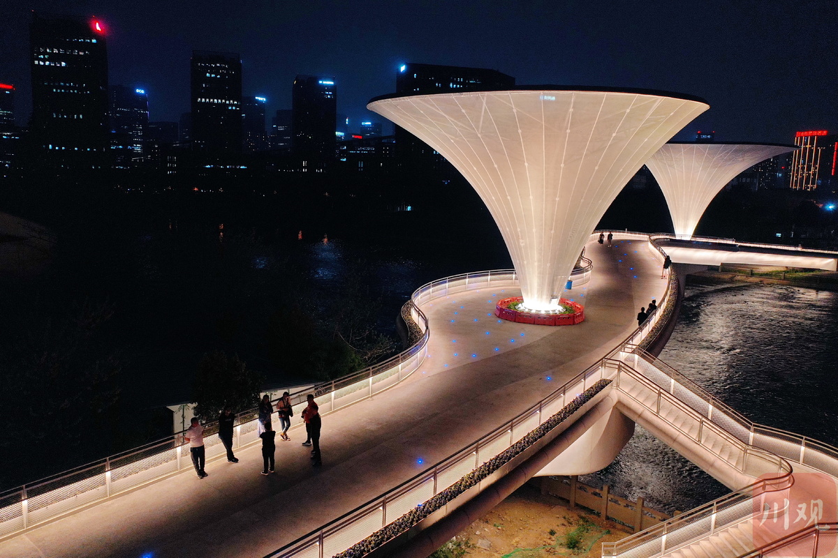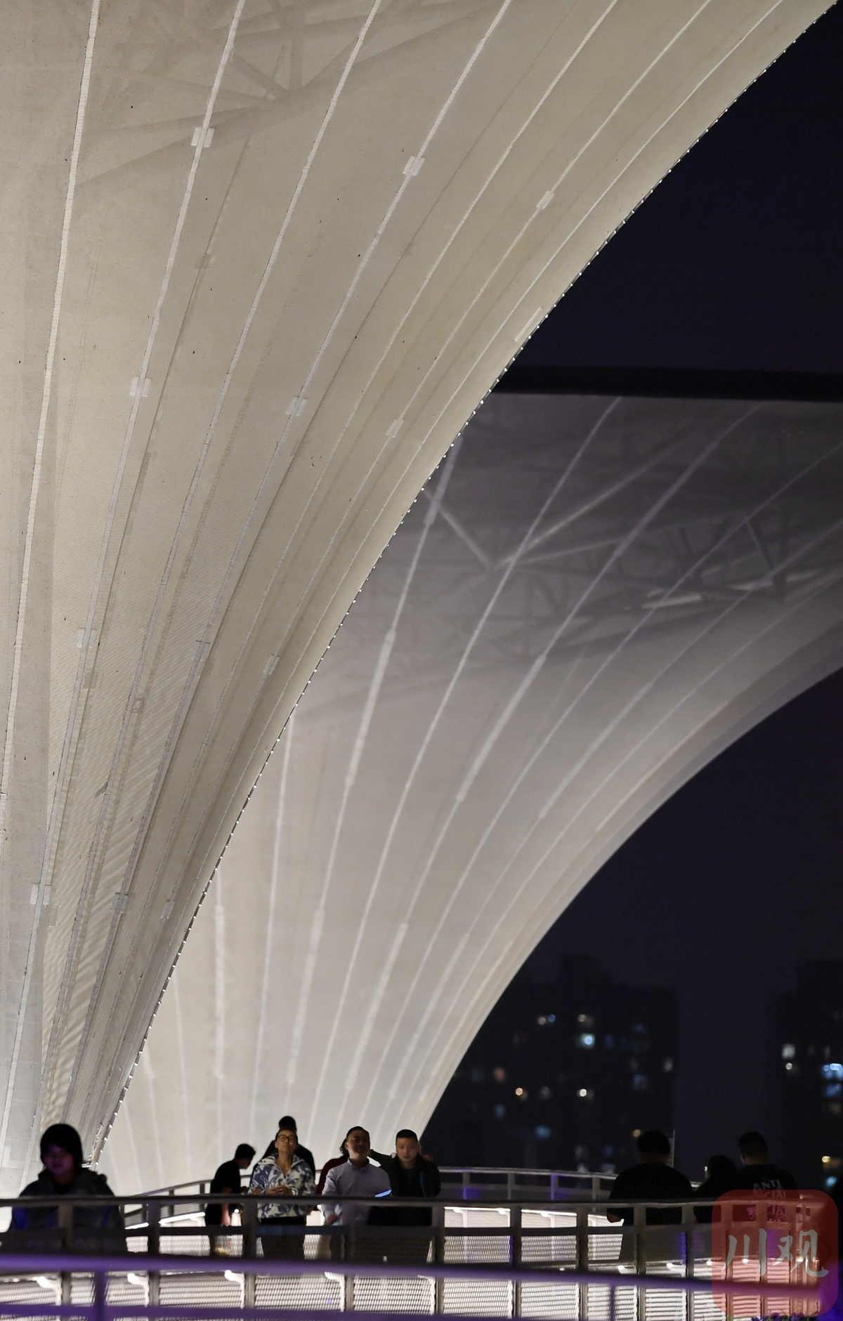 连日来,位于成都高新区老成仁路跨锦江人行天桥通行,独特的造型在夜色下迅速走红网络,成为市民新的打卡地。3月16日晚上,川观新闻记者来到位于成都高新区老成仁路跨锦江人行天桥看到,桥面同波光粼粼的江水相映成趣,桥上三三两两的行人一边散步一边欣赏沿途的锦江风光。