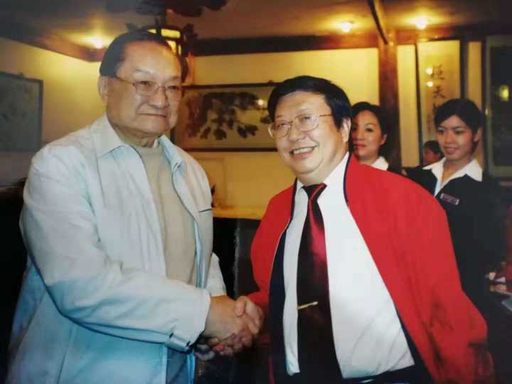 1998年金庸在香港宴请魏明伦夫妇。