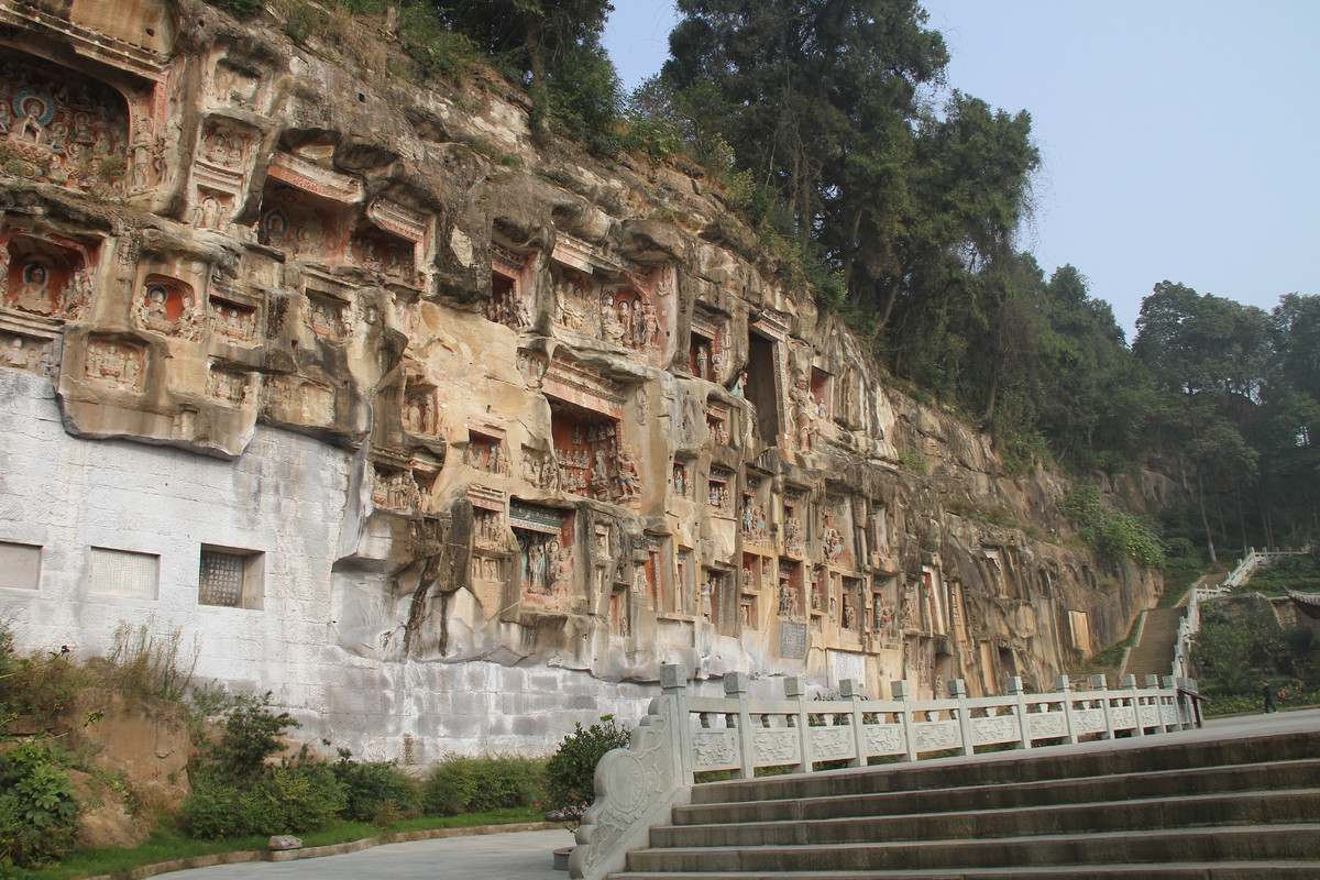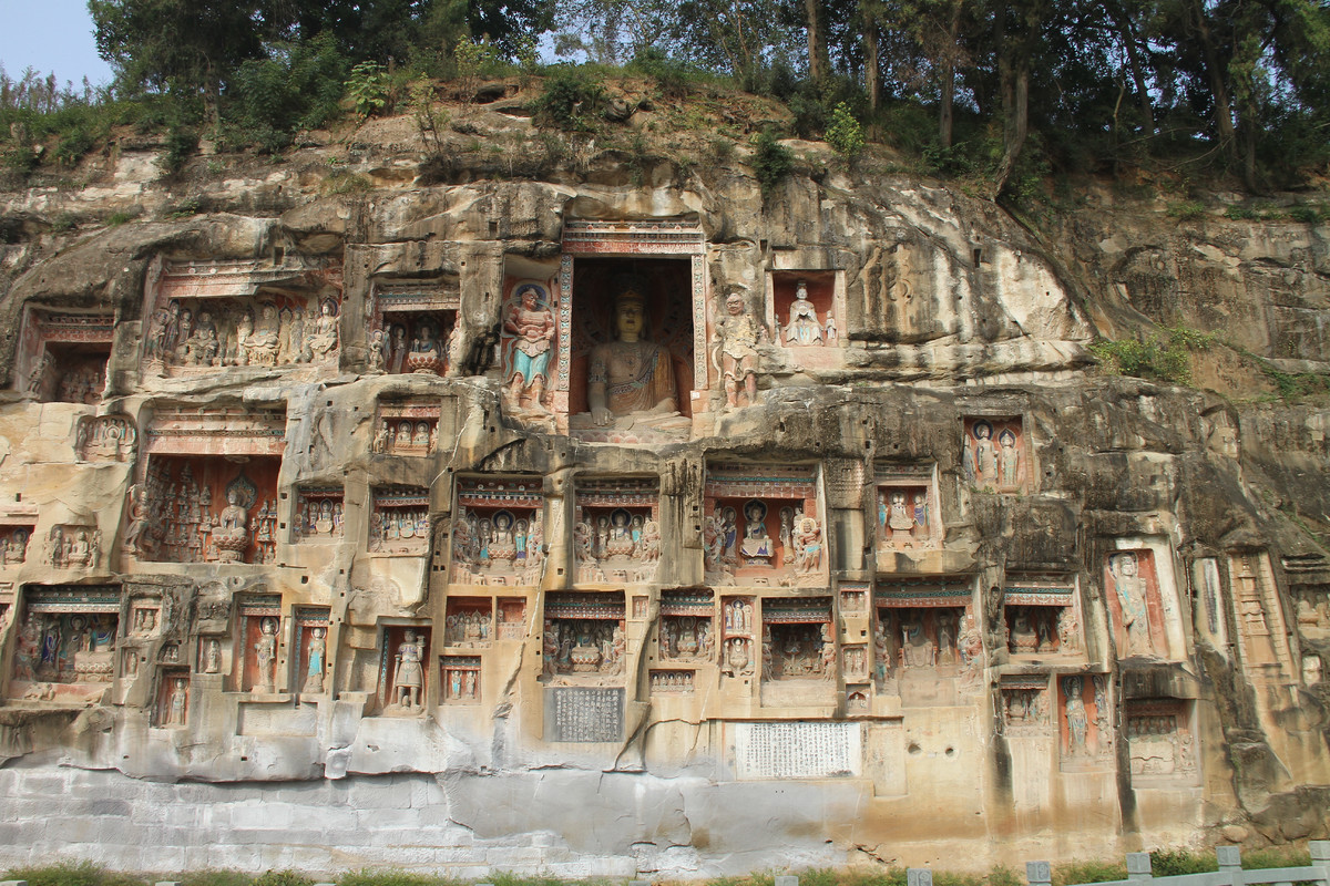 巴中是古代南北交通要道——米仓道的必经之地。唐宋时期,米仓道非常繁荣,南来北往的商人、官员和文人在巴中驻足,沿着山崖石壁开窟造像、装彩题词。巴中现存石窟59处500余龛窟,其中,以南龛石窟规模最大、保存最好、艺术最精美,成为巴中石窟的代表。