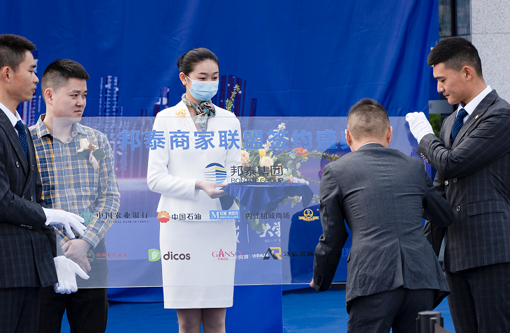 当天上午,除了彩烟舞、醒狮舞狮表演之外,亮相活动还举行了邦泰商家联盟签约仪式。内江邦泰联合中国农业银行内江支行推出邦泰联名卡,历时半年洽谈近百家合作商家,未来邦泰业主将通过邦泰联名卡,在内江联盟商家消费享受专属福利。