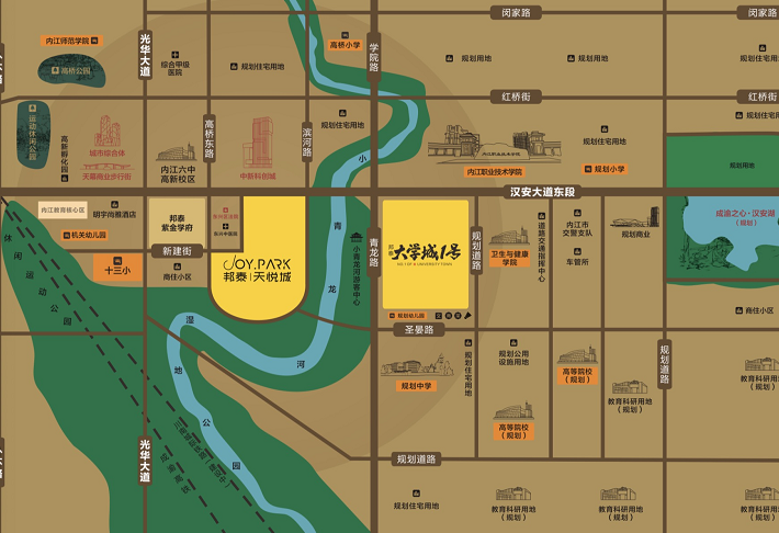 据悉,邦泰·天悦城&大学城1号项目位于内江城东核心地段、小青龙河湿地公园两侧,该项目占地面积400余亩,涵盖高层住宅、洋房、合院、社区底商、商业街、公寓、酒店等业态。