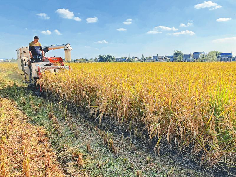 广汉金鱼镇水稻机收现场。(金鱼镇供图)