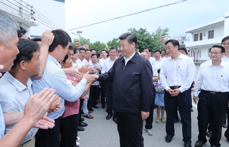 5月20日至22日,中共中央总书记、国家主席、中央军委主席习近平在江西考察,主持召开推动中部地区崛起工作座谈会并发表重要讲话。这是习近平在赣州市于都县梓山镇潭头村看望当地群众,同乡亲们亲切握手。