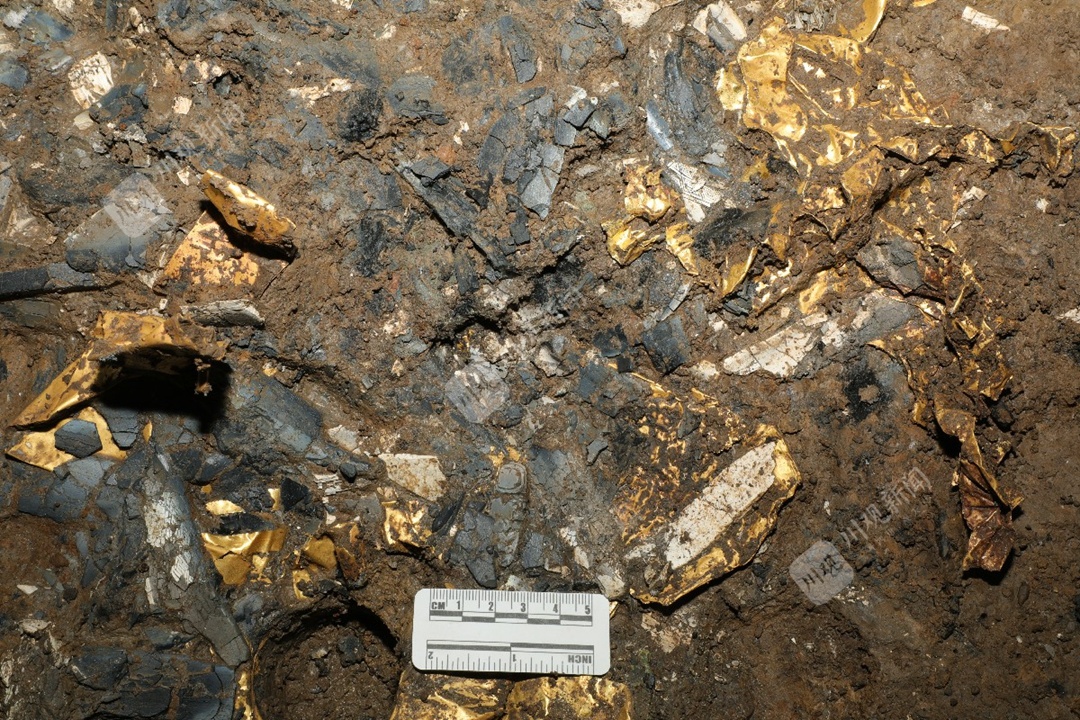 考古人员回忆,“最初看到金箔的一角,大家都没有太多的设想。”随着考古发掘人员用竹签、竹刀和油画笔刷子小心细致地清理金箔周围的泥土,没想到金箔所展现出来的体量越来越大,与周围散落的小金圆片和残碎的象牙形成了鲜明对比。