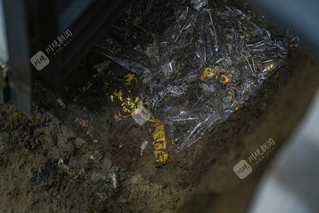 发掘深度到50厘米左右时,文物开始逐渐展露。考古人员告诉川观新闻记者,最开始出现的是一些小的穿孔金圆片,然后发现了大量白色和灰黑色的碎片,通过成分分析等检测方法鉴定为象牙,然后在5号坑中间偏西南位置,一块比较大的金箔开始出现。