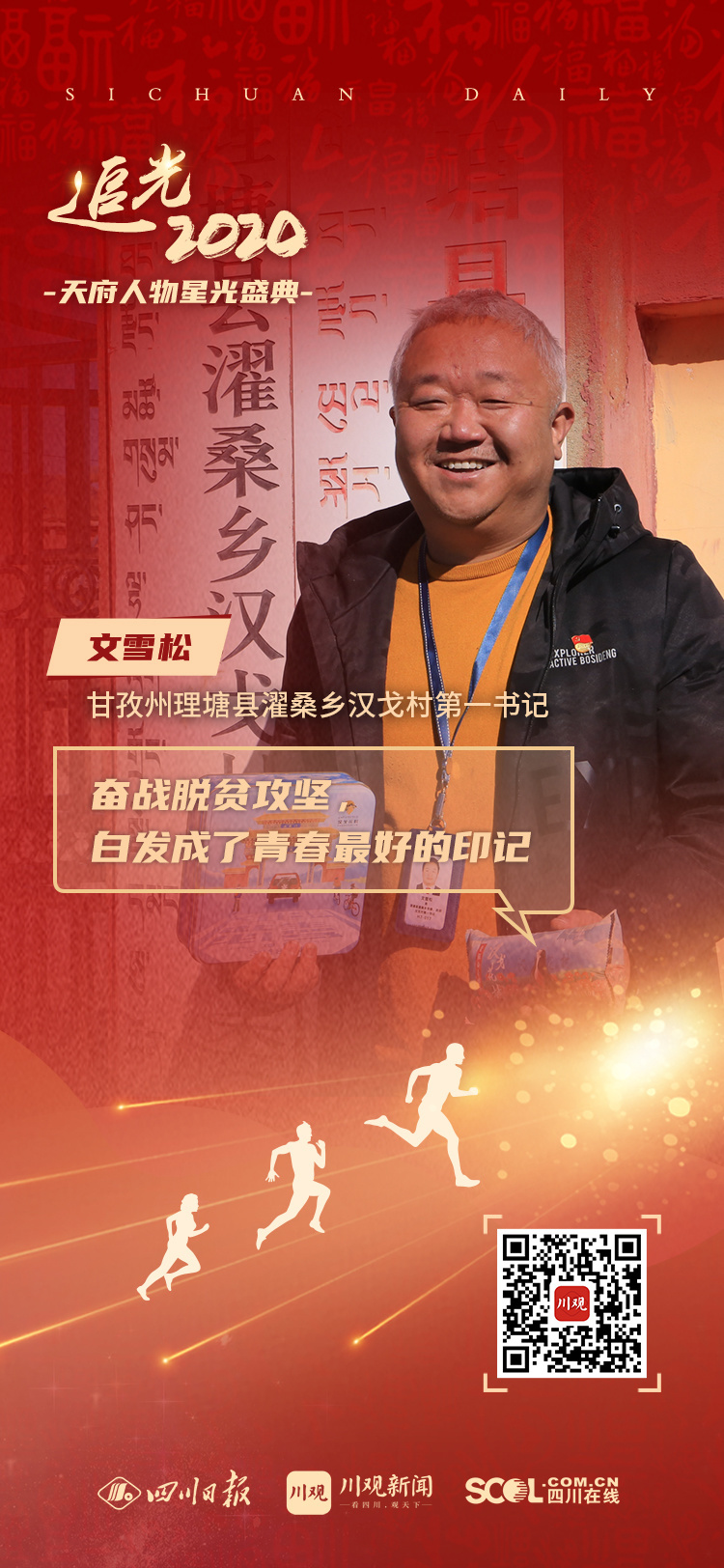 2019年,文雪松主动申请到汉戈村担任驻村第一书记。一年多来,他尽力工作,包括做网络主播给村里带货等,带领村民脱贫奔康,从一头黑发“小伙”,变成了满头白发的“大爷”。2020年年底,媒体关注到理塘,这位“白发书记”和丁真一起火了。