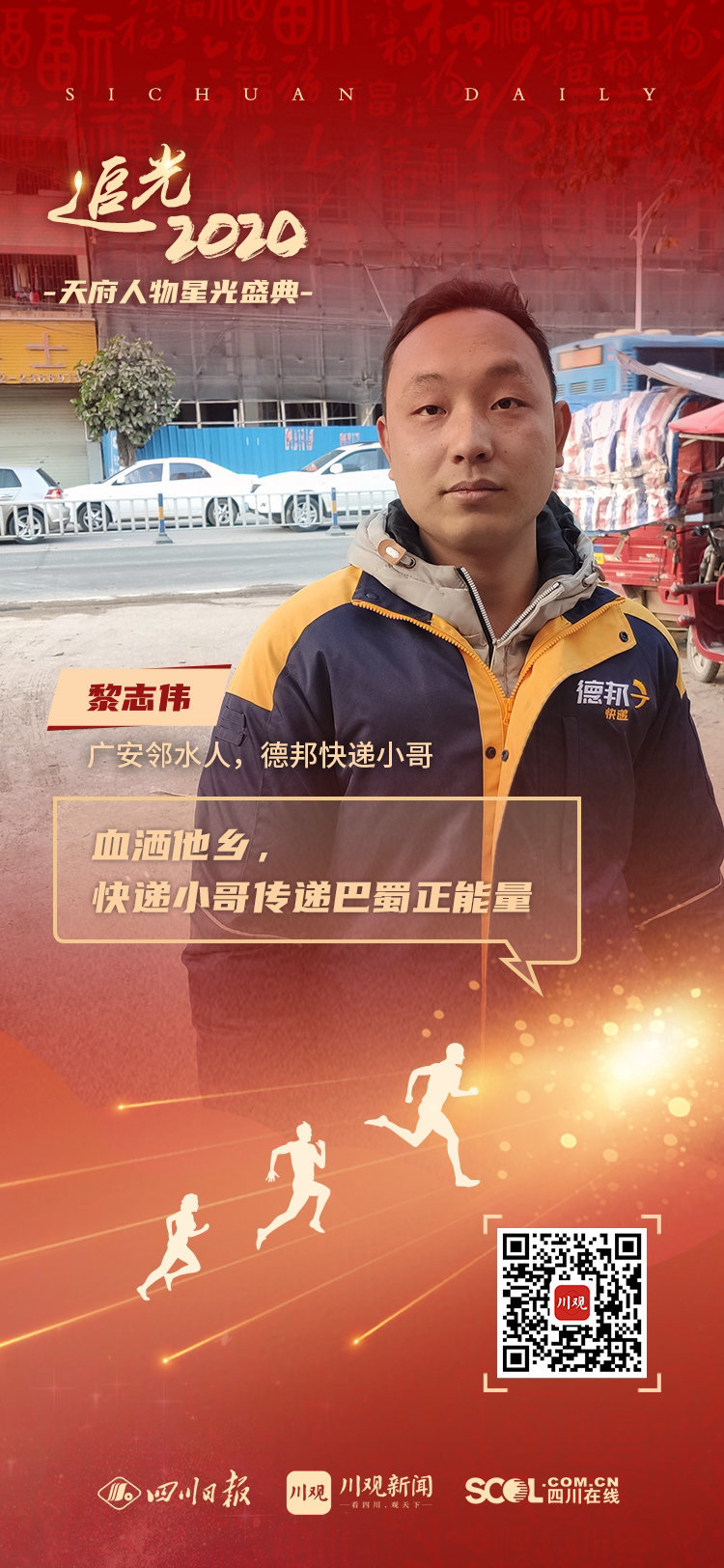 挻身而出洒热血,快递小哥护生命。在广东惠州,送件途中发现一名10来岁的小女孩被持刀男子追赶,快递小哥挺身上前,挡在两人中间。小女孩脱险了,他却身中两刀,失血过多晕倒在地。到医院后,背部伤口缝了40多针。黎志伟,快递小哥,他乡递巴蜀正能量。