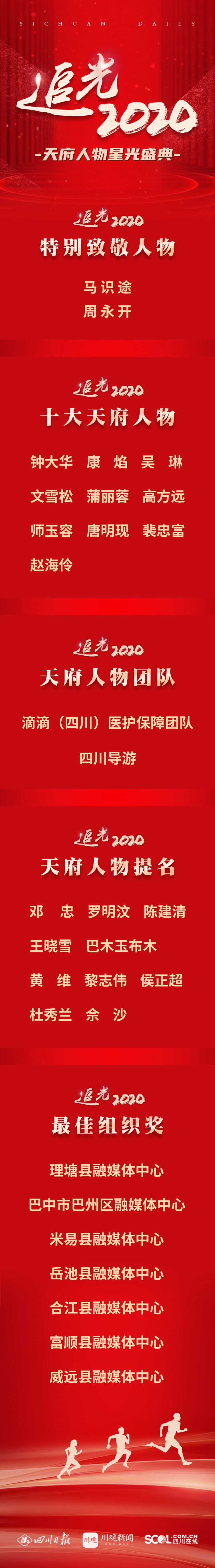 3月19日,由四川日报全媒体主办的追光2020天府人物星光盛典活动在成都举行,活动评选出“特别致敬人物”“十大天府人物”“天府人物团队”“天府人物提名”四大榜单,以及活动最佳组织奖。这也意味着历时两个多月的追光2020年天府人物推介活动圆满落下帷幕。