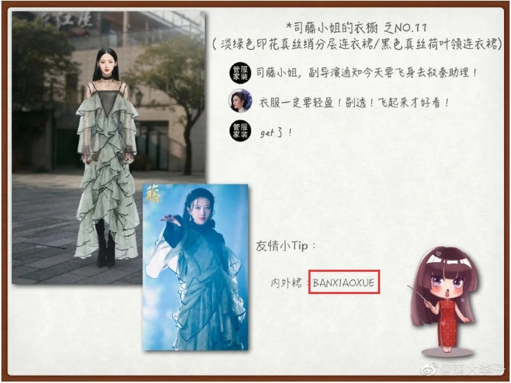 不少网友注意到,《司藤》服装造型中出现过中国独立设计师品牌BAN XIAOXUE 。
