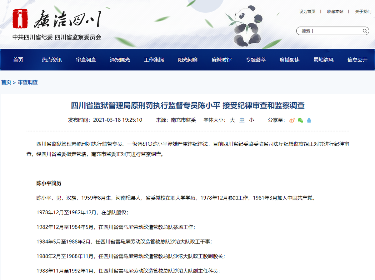 3月18日,四川省纪委监委网站“廉洁四川”权威发布:四川省监狱管理局原刑罚执行监督专员、一级调研员陈小平涉嫌严重违纪违法,目前四川省纪委监委驻省司法厅纪检监察组正对其进行纪律审查,经四川省监委指定管辖,南充市监委正对其进行监察调查。