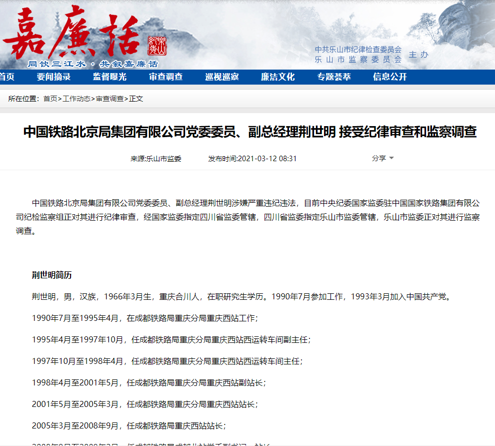 而几天前的3月11日,廉洁四川也发布一条消息:中国铁路北京局集团有限公司党委委员、副总经理荆世明涉嫌严重违纪违法,目前中央纪委国家监委驻中国国家铁路集团有限公司纪检监察组正对其进行纪律审查,经国家监委指定四川省监委管辖,四川省监委指定乐山市监委管辖,乐山市监委正对其进行监察调查。