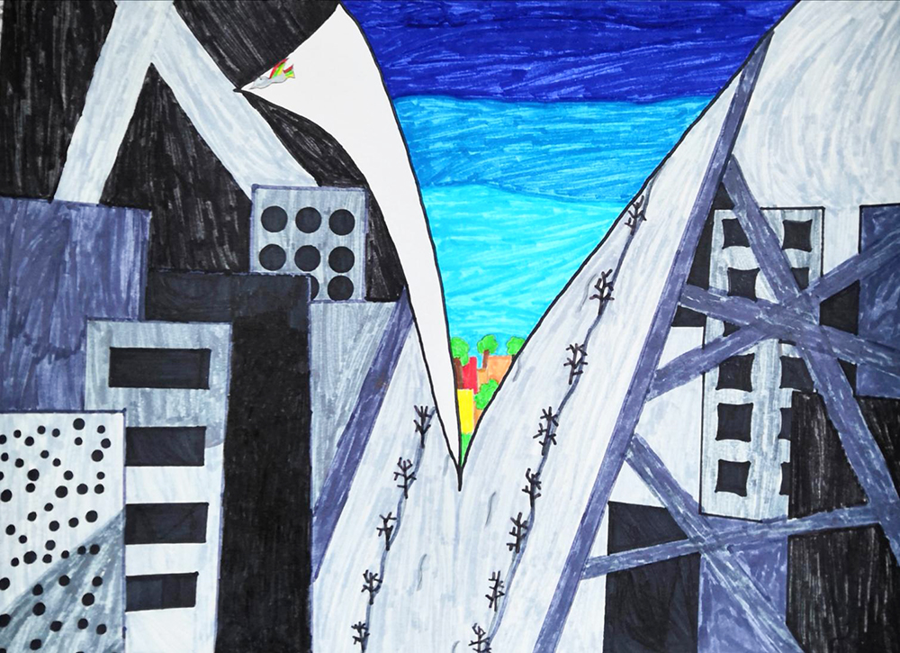 作品《还我蓝天》来自江阳区大北街小学校六年级一班的冯思语,画中以大面积的灰色天空为背景,正上方画出“撕裂”的效果,露出一角蓝天白云,画面效果尤为醒目。作品简介中写道“现代经济的发展,伴随着环境的污染与恶化,在大力倡导绿色环保的今天,只要我们能心系环保,发展经济的同时,注重保护环境,就一定能撕开眼前的阴霾,迎接美好的明天!”