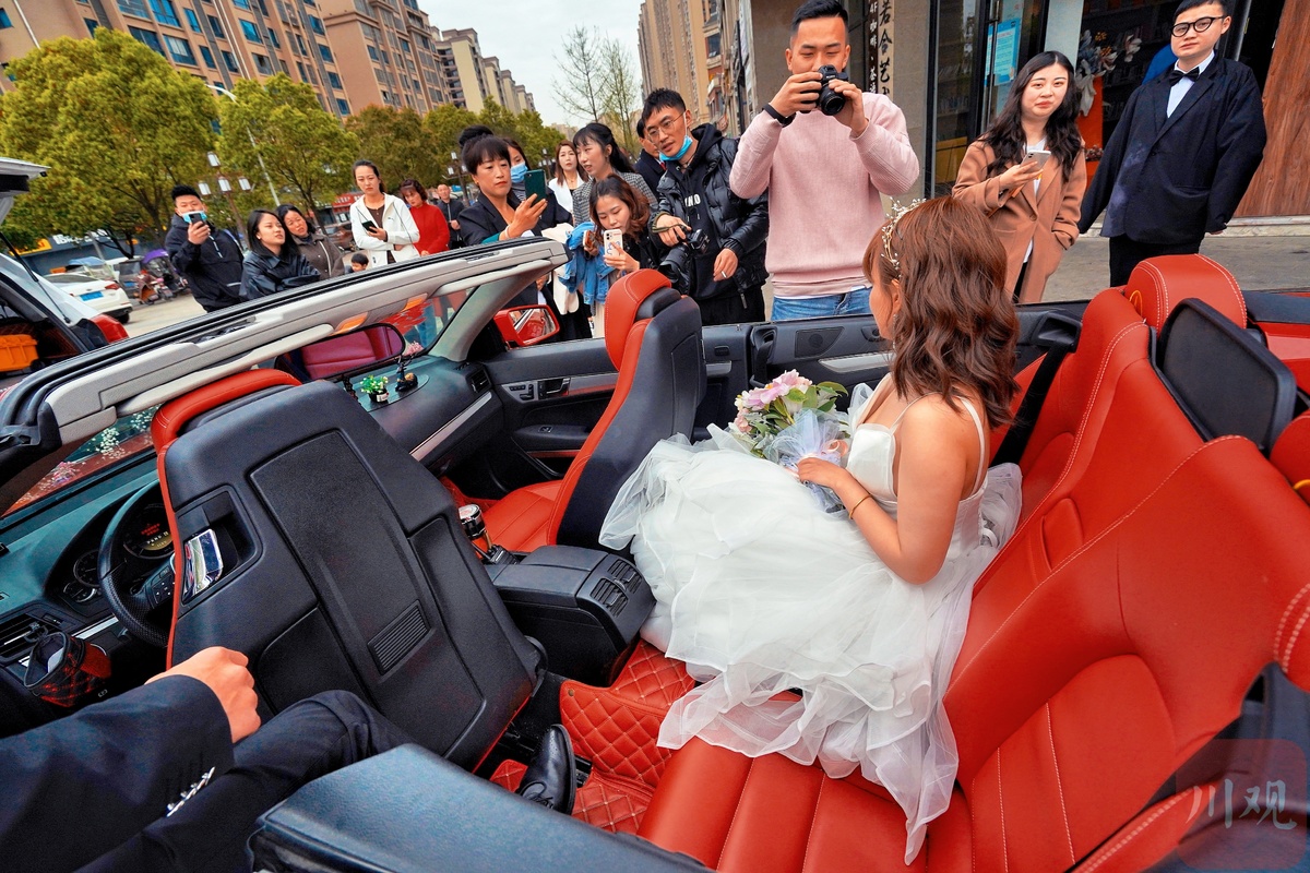 春分时节,安州街头喜迎新人的场面。