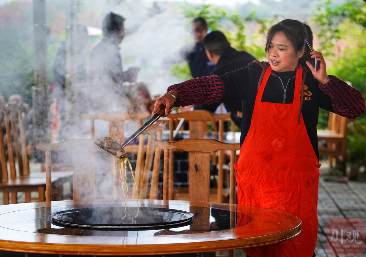 花丛中的小木屋炊烟袅袅,土灶里跳出的柴火星让铁锅里的柴火鸡香气四溢。50岁的周永秀是八角乡村民,烹饪一手柴火鸡美食,她说每个周末,来百花乐园赏花游玩的游客是车来人往,花丛中品尝柴火鸡也是当地踏青的一大特色。