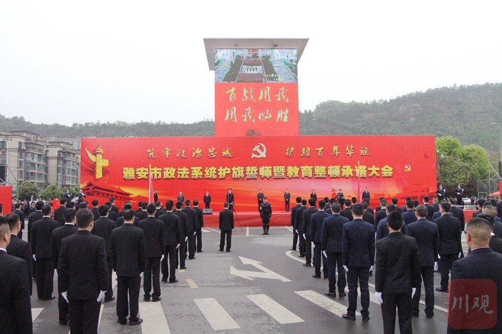 当前,正值雅安深入开展政法队伍教育整顿的关键时期,也是建党100周年安保攻坚战全面打响的关键阶段。“我宣誓:对党忠诚、服务人民、执法公正、纪律严明。我承诺:认真参加政法队伍教育整顿,以优异成绩庆祝建党100周年!”在庄严的国歌声中,来自雅安市、县(区)两级政法委和法院、检察院、公安、国家安全机关、司法行政机关等单位的1100余名干警庄严宣誓,全员参战、全时迎战、全力决战,夺取建党100周年安保维稳战役全面胜利,向党和人民交上一份满意的答卷。