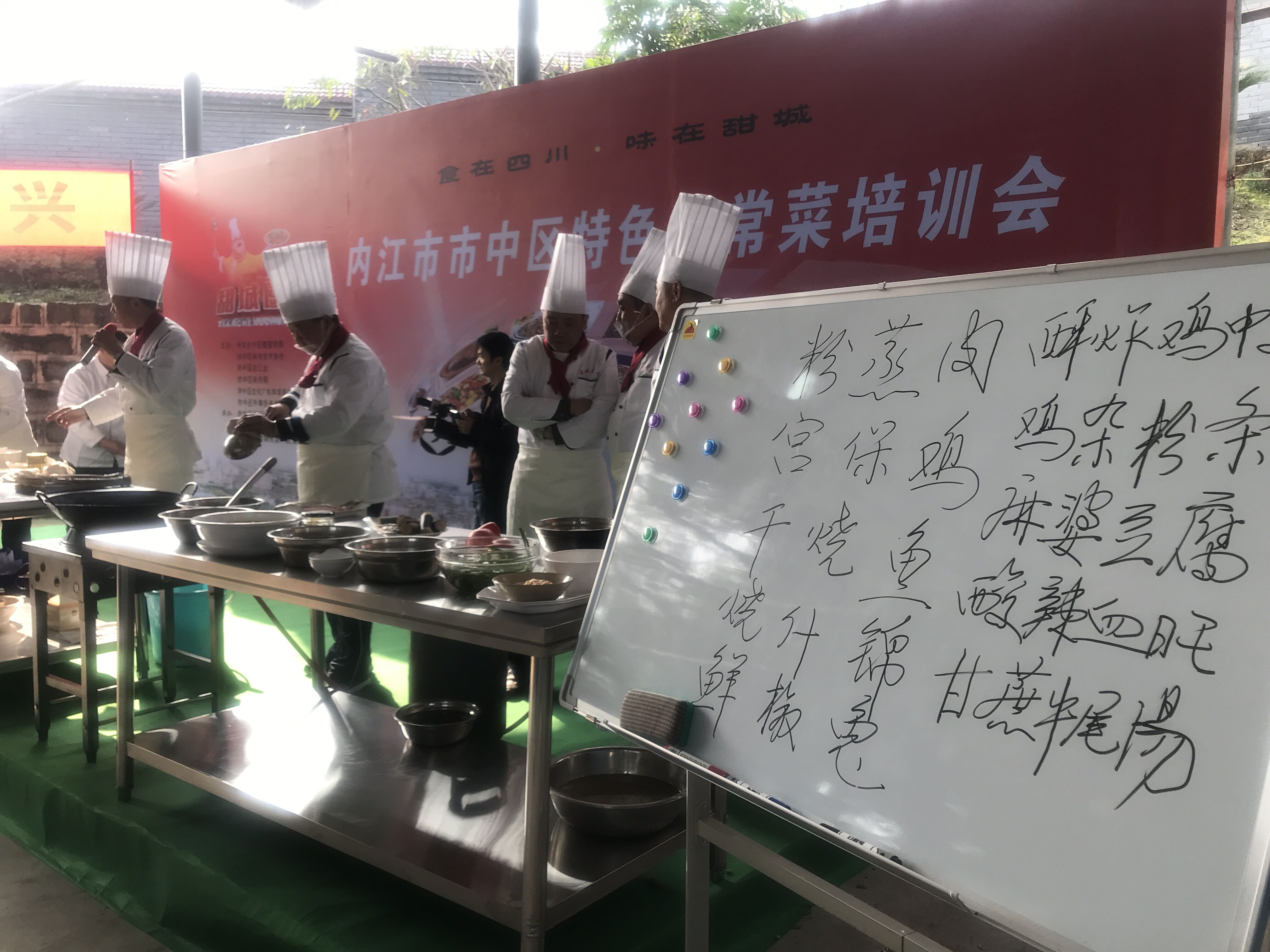 培训会现场共烹制了十道菜:粉蒸肉、宫保鸡丁、干烧鱼、烧什锦、鲜椒兔、酥炸鸡中翅、鸡杂粉条、麻婆豆腐、酸辣血旺、甘蔗牛尾汤。每道菜均是川菜的经典,是市中区特色家常菜培训的“教材”。