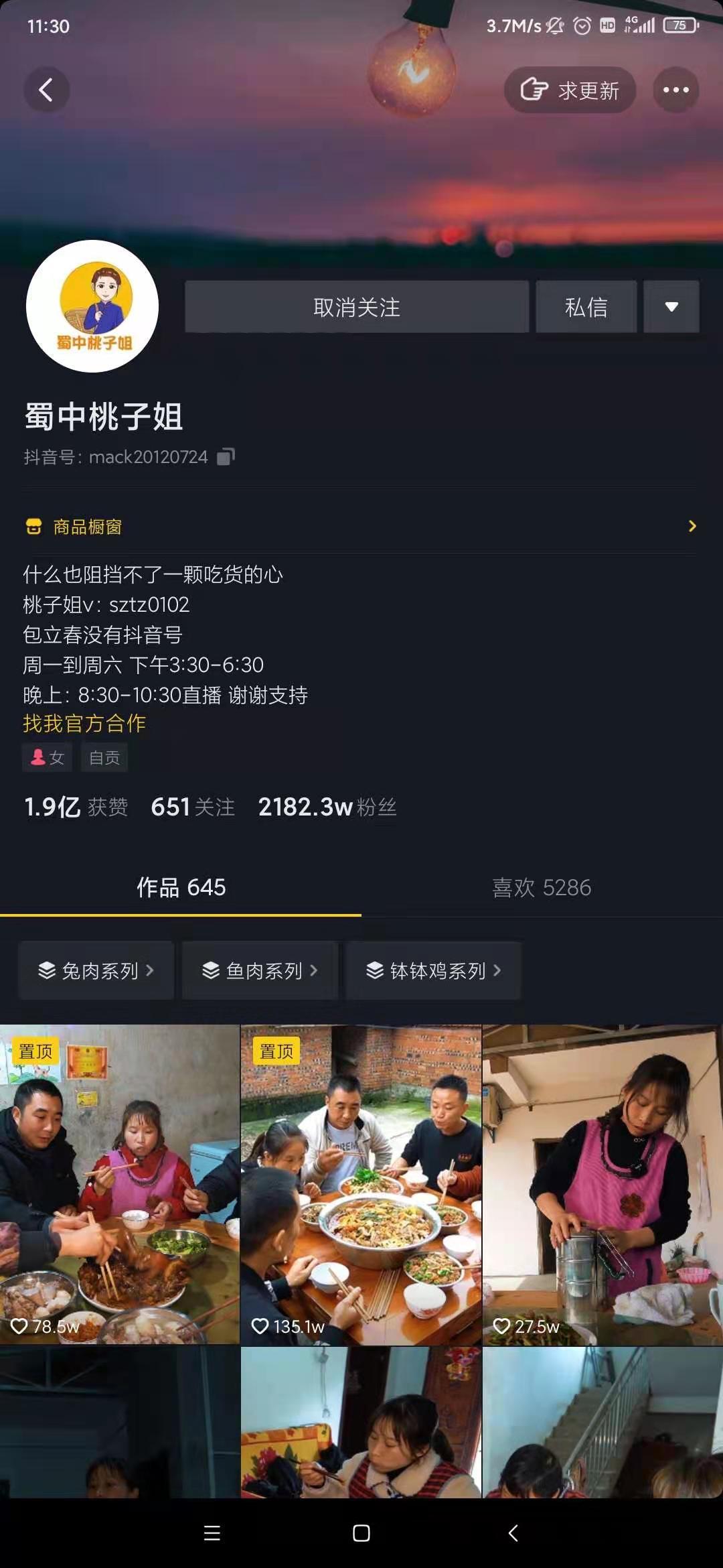 桃子姐的视频主要是家庭川菜制作与享用、乡村生活等内容,其接地气的视频内容被不少网友称为“人间烟火”和“热气腾腾的人生”。桃子姐至今在抖音平台更新600余个作品,作品总获赞数1.8亿,目前有2114.8万粉丝。