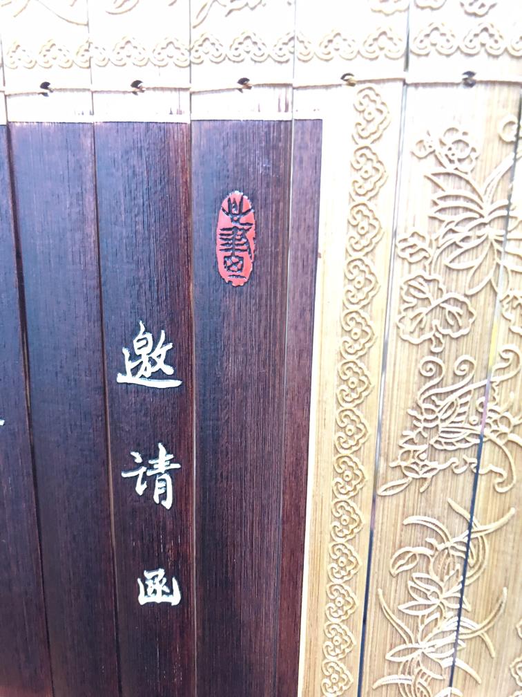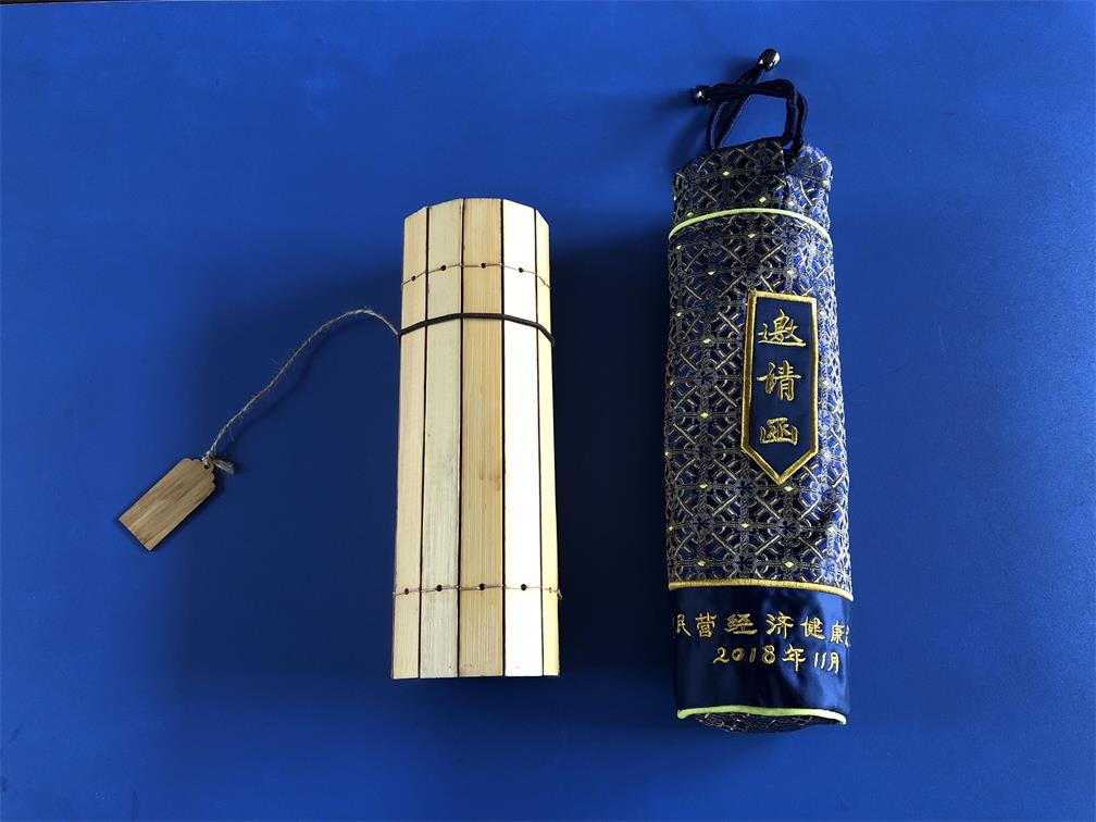 字体方面,最开始选用的是电脑字体排版,但是做出来的效果没有特色。最终,制作方联系到一位川内书法家,邀请函上全部文字便出自他的手。此外,邀请函上文字本来采用了阴刻技法,所有文字在竹简平面上凹陷下去。后来几次讨论后,改为了阳刻,即文字凸出在竹简表面,触摸起来更有质感。