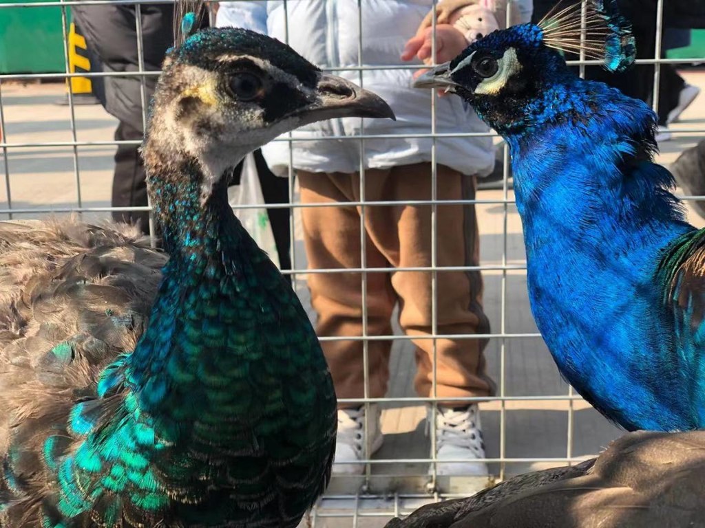 (孔雀,左边为雌孔雀,右边是雄孔雀。周梦颖摄)