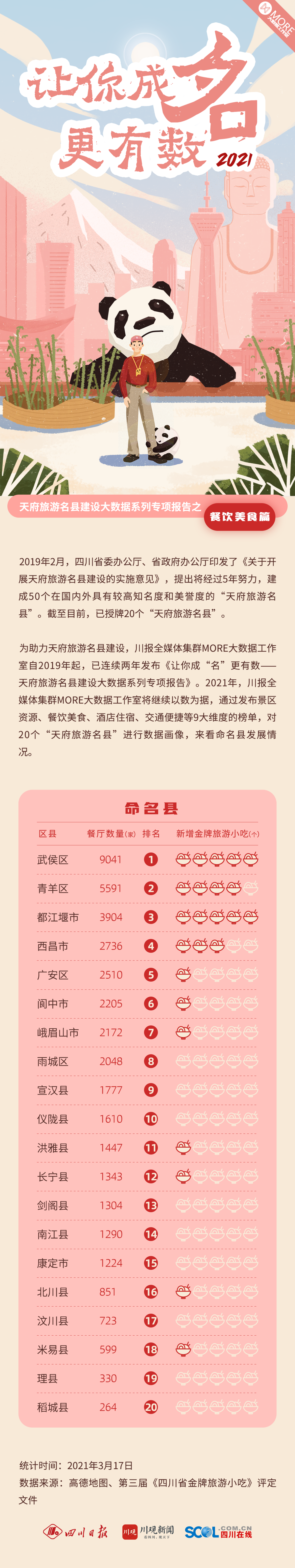 为助力天府旅游名县建设,川报全媒体集群MORE大数据工作室自2019年起,已连续两年发布《让你成“名”更有数——天府旅游名县建设大数据系列专项报告》。2021年,川报全媒体集群MORE大数据工作室将继续以数为据,通过发布景区资源、餐饮美食、酒店住宿、交通便捷等9大维度的榜单,对20个“天府旅游名县”进行数据画像,来看命名县发展情况。