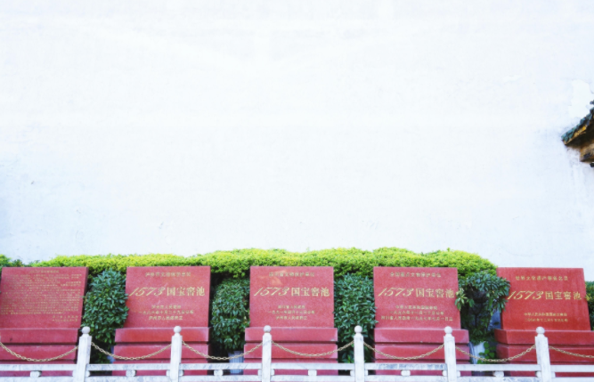 窖池外,墙角处,立着几座石碑。红底金字,记录着“1573窖池”从1986年以来的荣耀。“泸州市文物保护单位”“四川省文物保护单位”“全国重点文物保护单位”“世界文化遗产预备名录”。从左至右,将“1573窖池”日日前进的历史,平铺在游客眼前,向世人展示泸州老窖“活文物”。