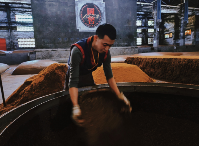 一挖一刨一铲,酿酒师傅光着膀子的双臂抬起满满一簸箕拌好的红高粱往甑子左一甩右一甩……“得让拌好的高粱平均铺在甑子上,这是传统酿酒技艺中的一个环节,没有几年的技艺,很难做到让每一颗高粱都到它该到的地方。”酿酒师朱小强笑着说。