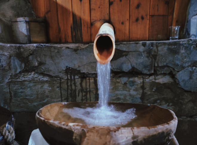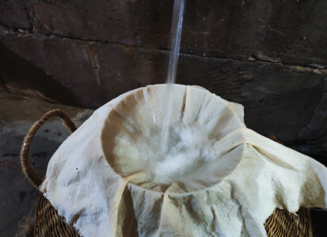 上甑完毕,众人齐力合上甑盖。不一会儿,牛尾巴处淌着潺潺流水。晶莹剔透的香酒注入陶罐,然后,被倒掉!原来,一甑的头、尾两段白酒,含异味、杂味,算作是不合格,最后被泼洒在封窖的黄泥上。中段白酒出甑,酿酒师守在牛尾巴旁“看花摘酒”,酒花越大,酒越好!