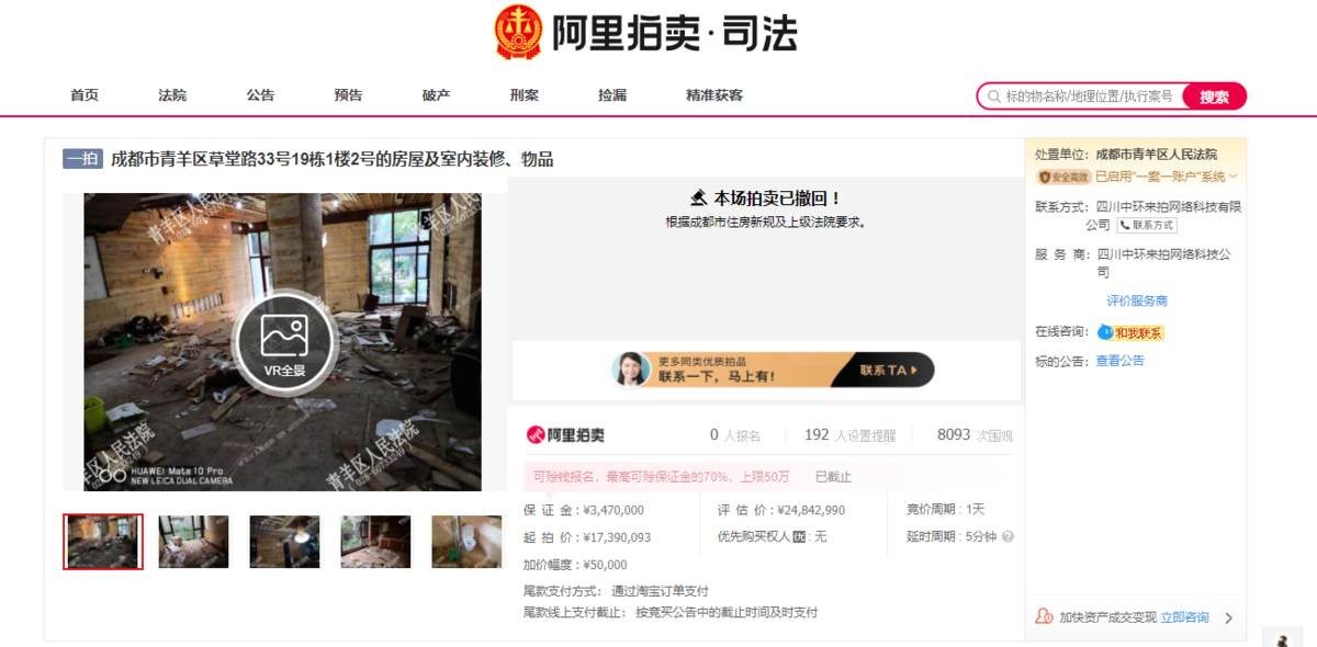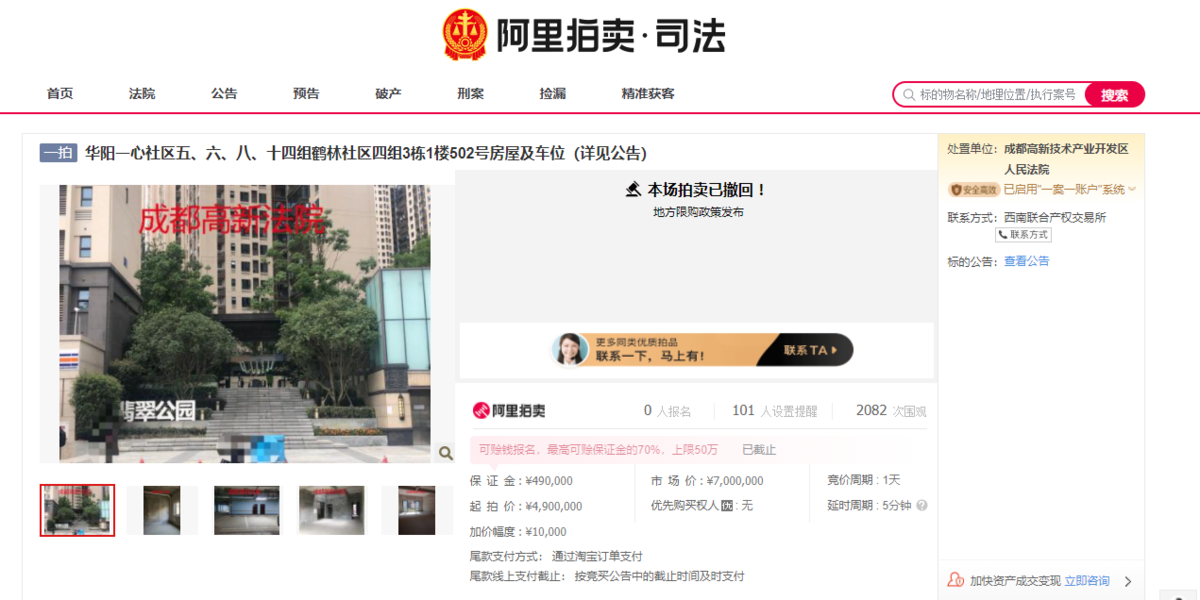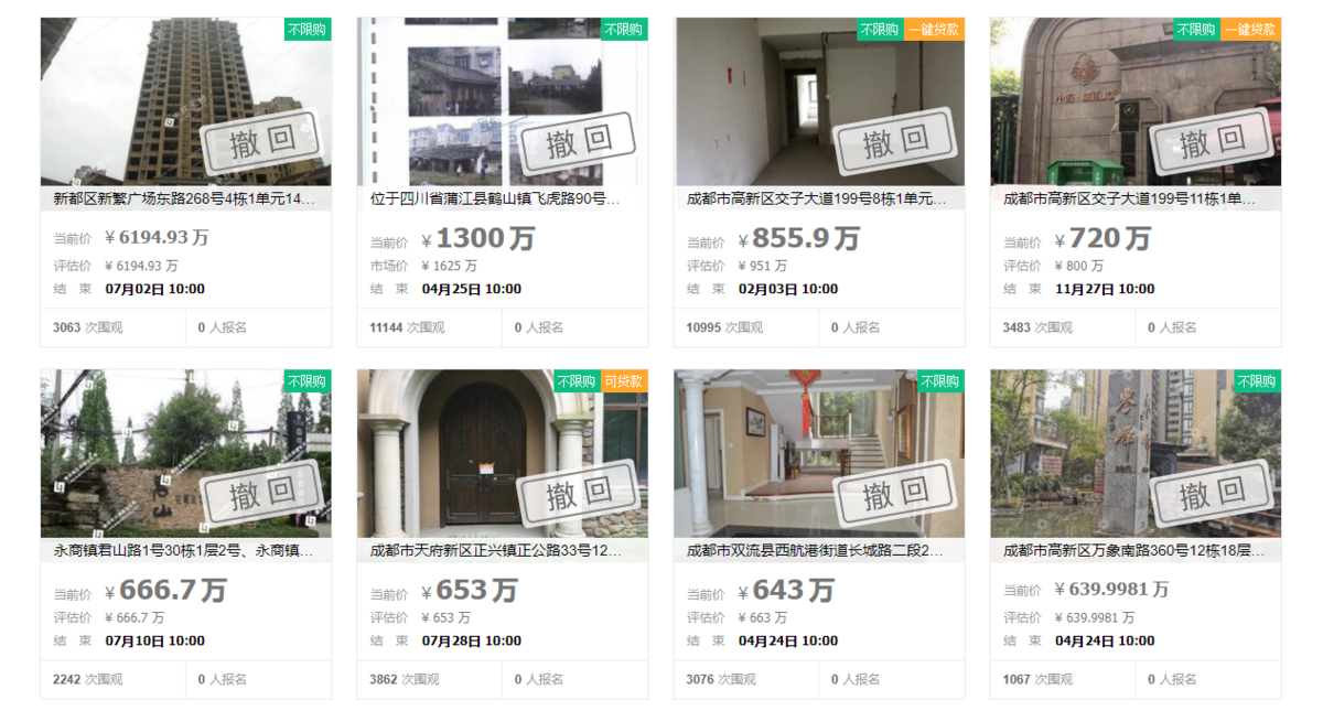 在京东拍卖网上,约440套住宅用房已被撤回,其中包括多套曾被围观上万次,分别位于天府新区华阳街道、龙泉驿区、金牛区、双流区、武侯区等热点区域的住宅用房。
