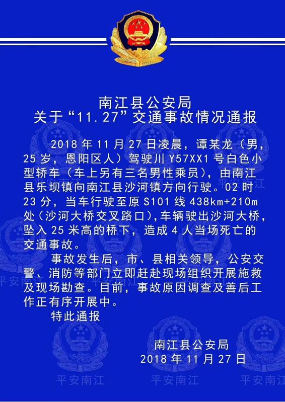 据介绍,27日凌晨,巴中市恩阳区25岁的男子谭某龙驾驶一辆白色小型轿车从南江县乐坝镇向南江县沙河镇方向行驶,车内除谭某龙外,还乘坐了3名男性乘客。凌晨2时23分,当车辆行驶到沙河大桥交叉路口时,坠下25米高的桥下,掉落在河滩,造成车上4人当场死亡。