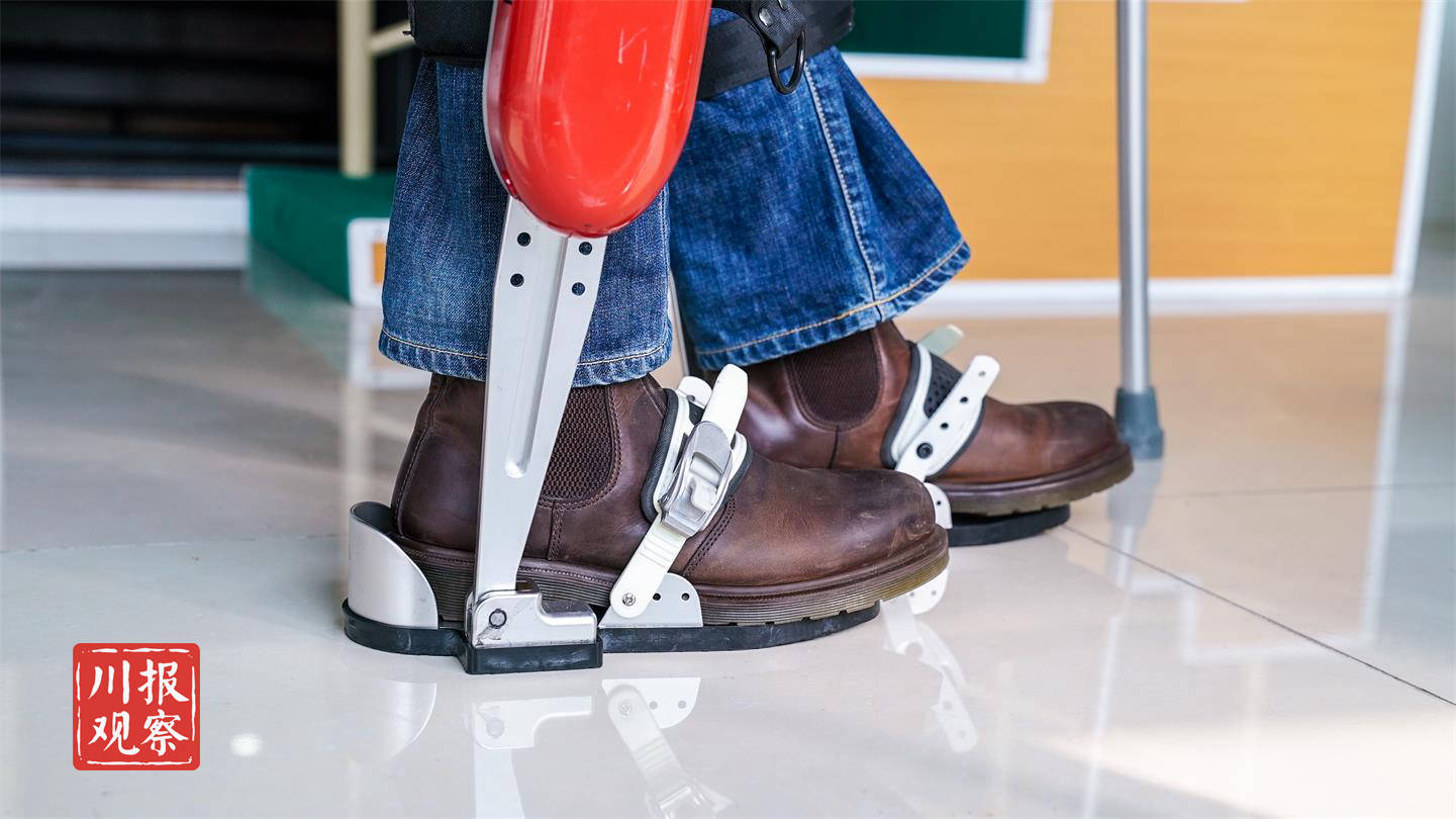 林寒2013年意外摔伤,导致背部脊髓损伤,下肢丧失行动能力。2015年他作为志愿者试穿这套外骨骼机器人,如今已熟练掌握了使用方式。“这套设备让我重新站了起来。”每天穿戴骨骼机器人训练行走,上下午各2小时,腰部在逐渐恢复知觉和力量。