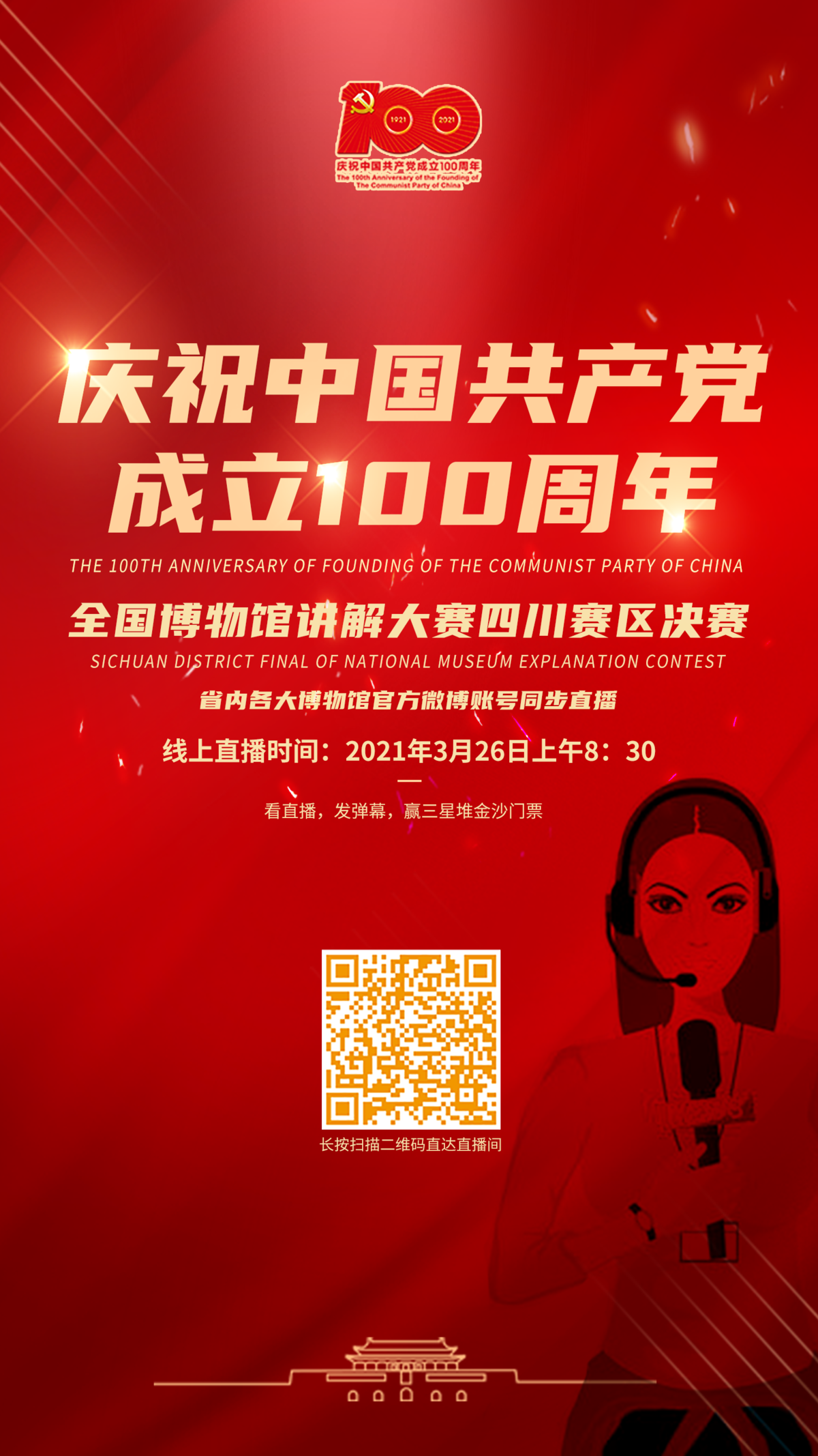 据介绍,此次大赛旨在庆祝中国共产党成立100周年,展现全省博物馆讲解员的文化素养和精神风貌,引导和鼓励博物馆讲解员更好地讲好中国故事,讲好中国共产党故事,讲好新时代中国特色社会主义故事。比赛由四川省文物局主办,四川省博物馆学会、四川省文物信息中心、邓小平故里管理局、邓小平故居陈列馆承办。此次大赛得到了全省博物馆热烈响应和积极支持,截止2021年3月21日,四川赛区的博物馆共选送了101名讲解员报名参赛。