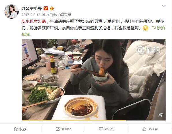 系列短视频“办公室小野”的主演原名周晓慧,是1994年出生的成都姑娘。她凭借“饮水机煮火锅”火爆互联网,并经常作为国内短视频创作者登上国际舞台。