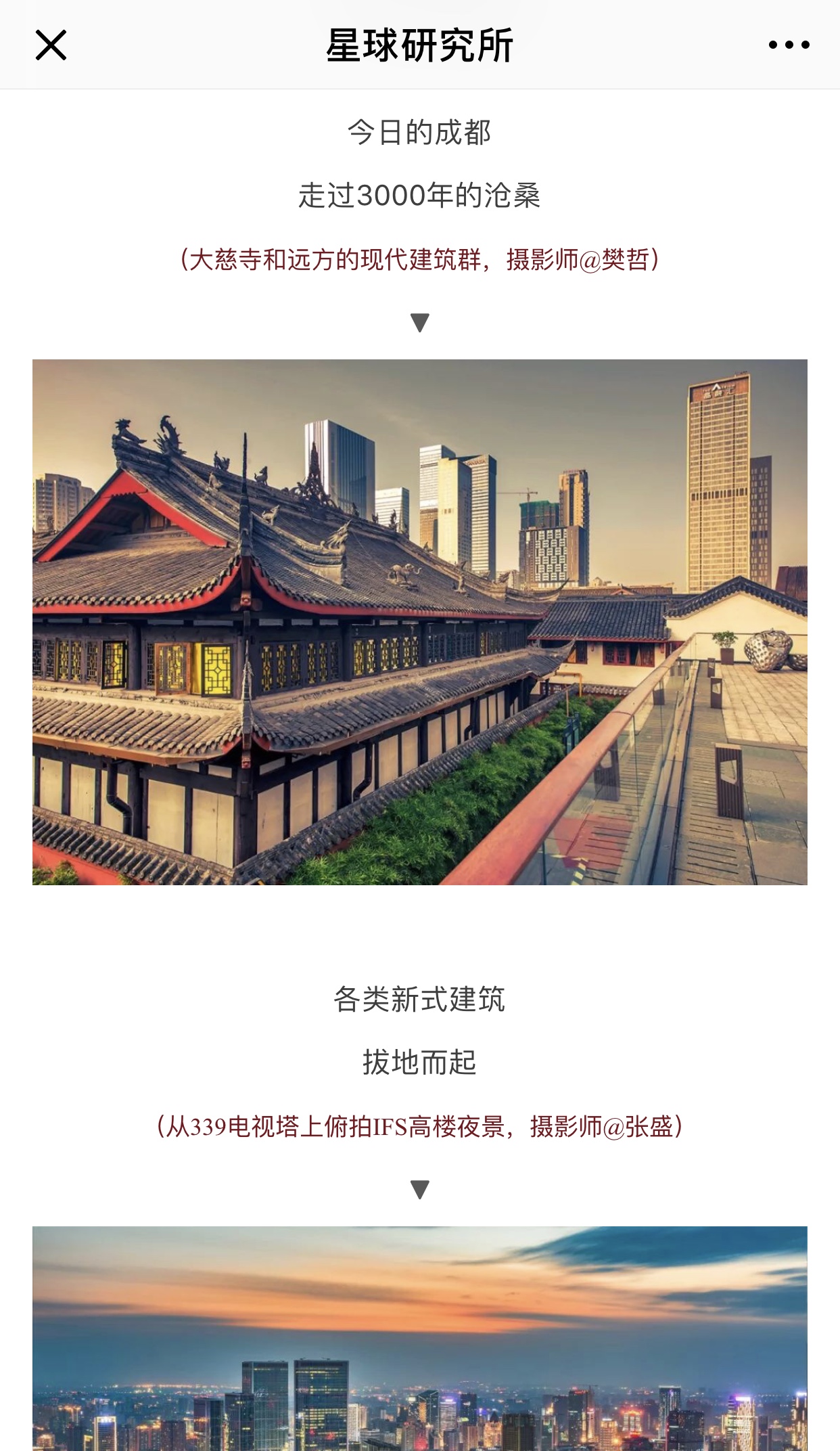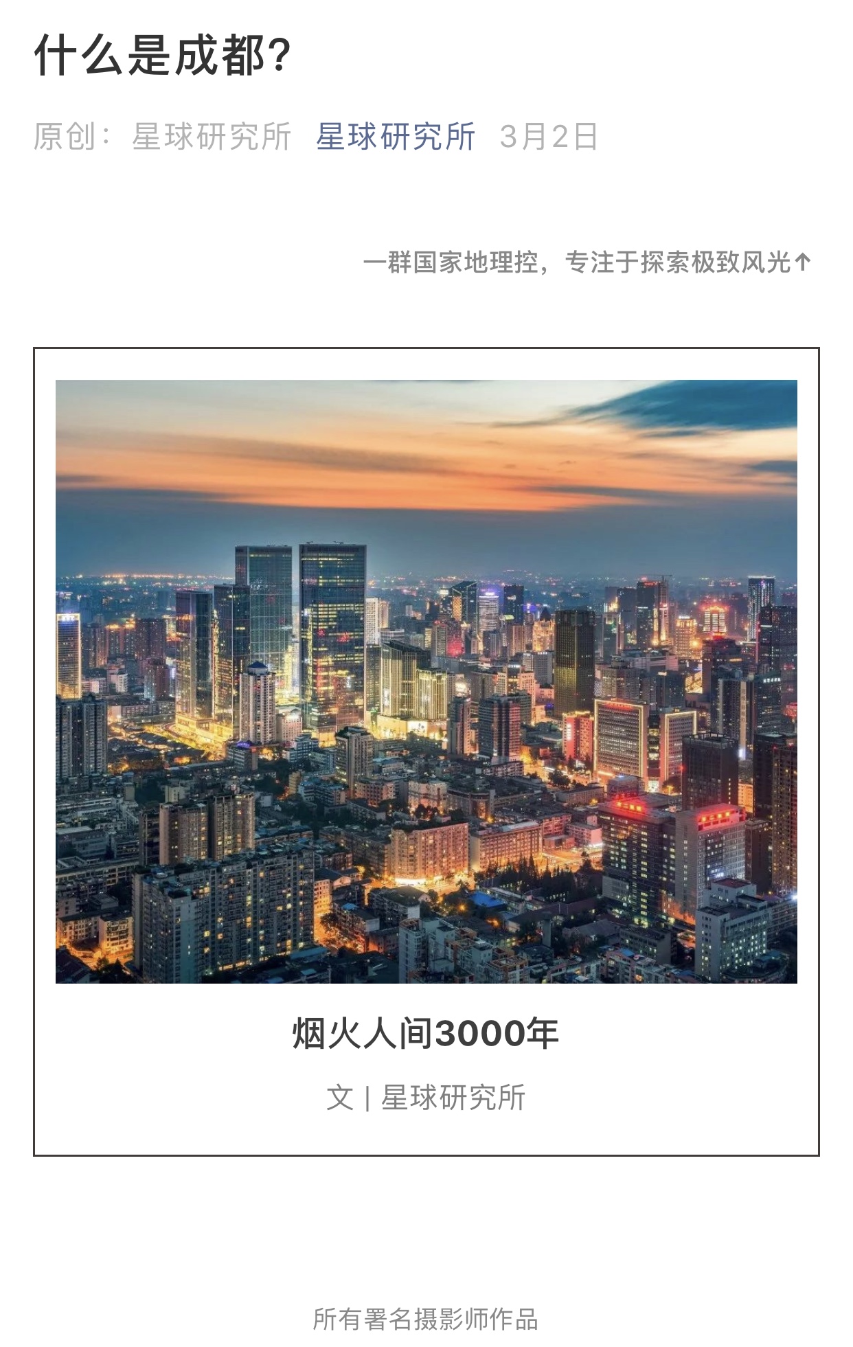 《什么是成都》从成都的诞生讲起,盘点其3000年的烟火人间。最令人震撼的是,全文穿插70多张高清精美配图,其中不乏许多大航拍、大全景横图,被网友称为“美到都可以拿来收藏做桌面”。