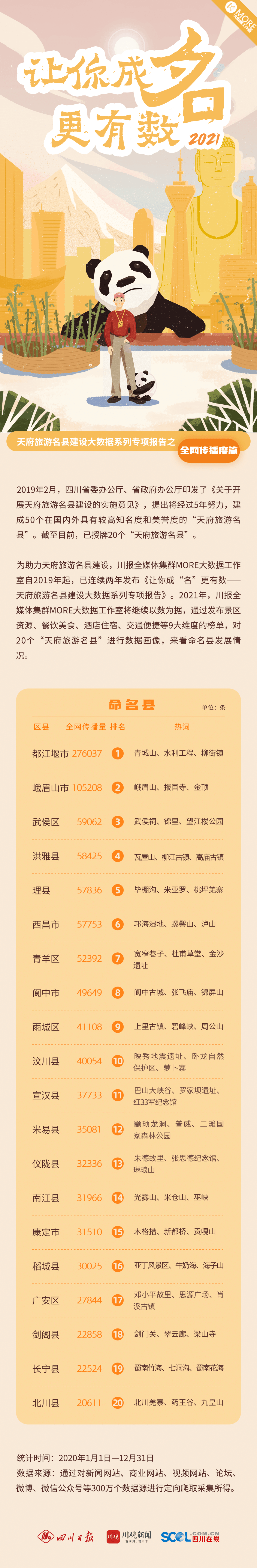 为助力天府旅游名县建设,川报全媒体集群MORE大数据工作室自2019年起,已连续两年发布《让你成“名”更有数——天府旅游名县建设大数据系列专项报告》。2021年,川报全媒体集群MORE大数据工作室将继续以数为据,通过发布景区资源、餐饮美食、酒店住宿、交通便捷等9大维度的榜单,对20个“天府旅游名县”进行数据画像,来看命名县发展情况。