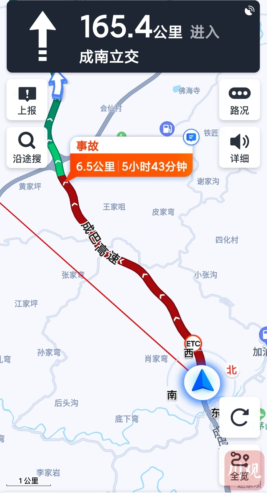 查看高德地图,显示前方出现交通事故,截至川观新闻记者发稿时已造成成巴高速6.5公里的拥堵,预计拥堵时间长达5小时43分。附近有村民向记者表示:“至少堵了有半个多小时了。”