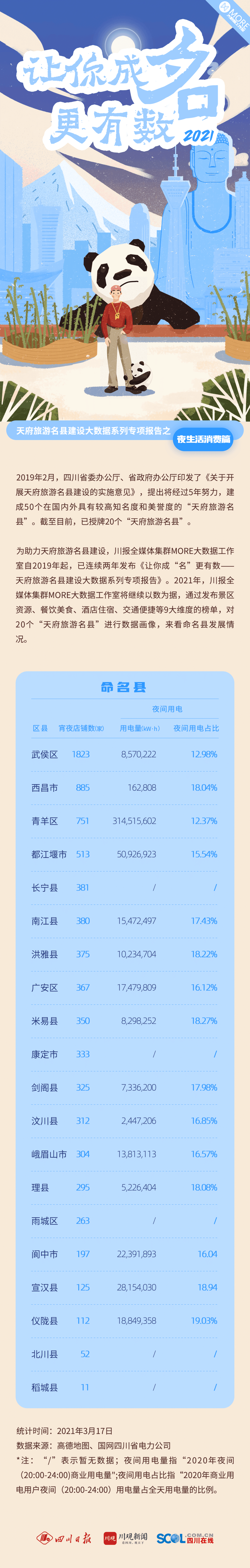 为助力天府旅游名县建设,川报全媒体集群MORE大数据工作室自2019年起,已连续两年发布《让你成“名”更有数——天府旅游名县建设大数据系列专项报告》。2021年,川报全媒体集群MORE大数据工作室将继续以数为据,通过发布景区资源、餐饮美食、酒店住宿、交通便捷等9大维度的榜单,对20个“天府旅游名县”进行数据画像,来看命名县发展情况。