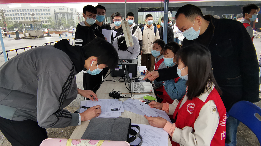 当天上午,考生们自觉佩戴口罩、有序排队,主动配合工作人员进行体温检测,在学生志愿者的引导下有序进行身份信息核验、资格审核、打印准考证等。