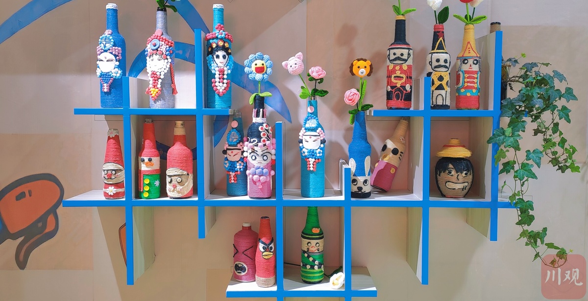 除了好看好吃的,还有好耍的。只见在一个写有“瓶饰创想”的工作坊外,围着橘色围腰和头巾的小学生们,正在手绘各种形状的酒瓶,而这些酒瓶都是废弃的酒瓶,来自江阳区黄舣镇中心小学校的美术老师和学生们,将它们变废为宝,改造成了一个个手工艺术品。